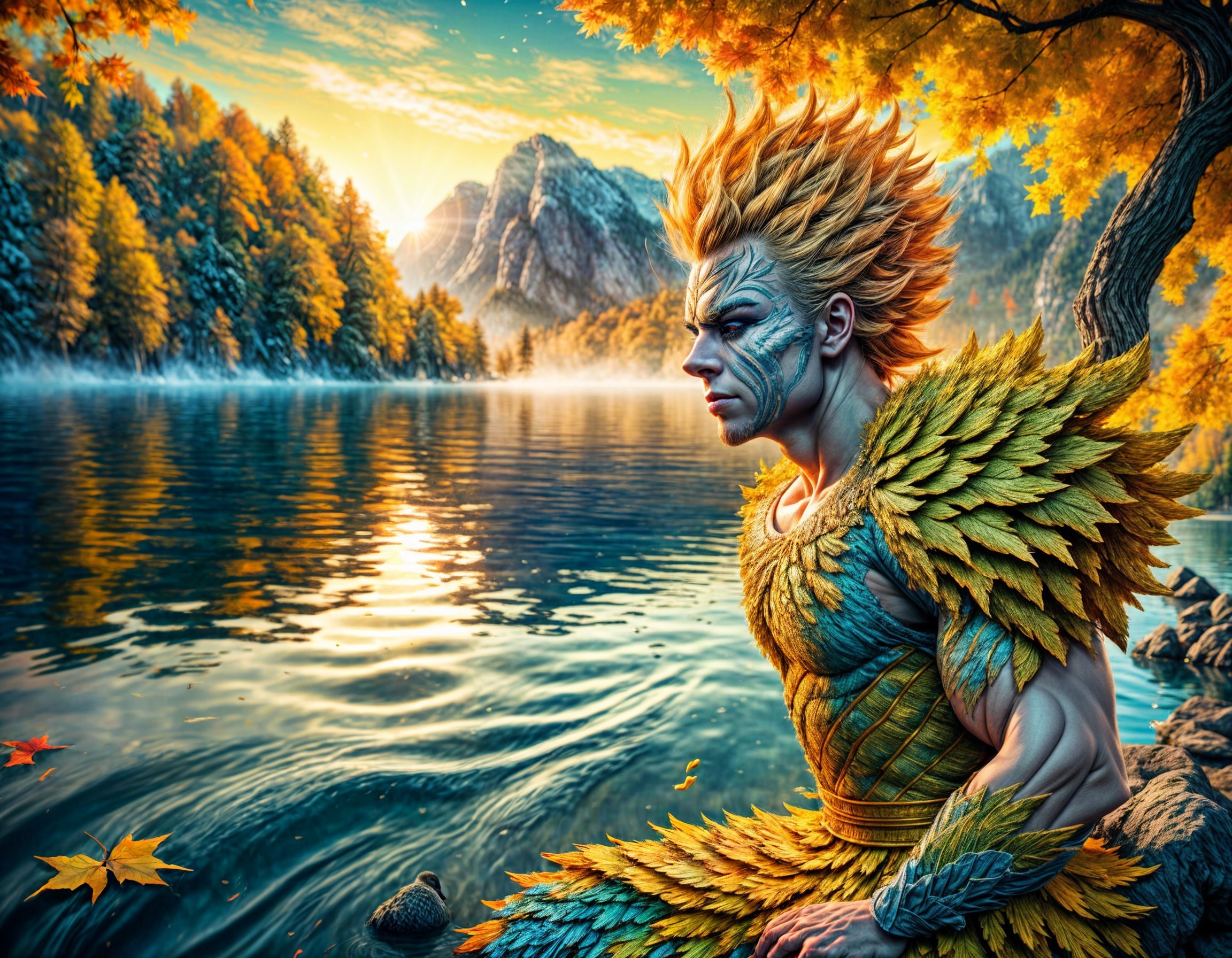 A fantasy figure with vibrant, spiky hair and feathered attire sits by a serene lake, surrounded by autumn foliage and mountains. A castle looms in the background against a colorful sky.