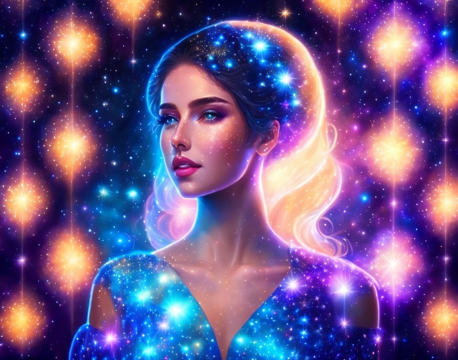 A beautiful young woman surrounded by stardust. She is wearing a blue transparent dress.