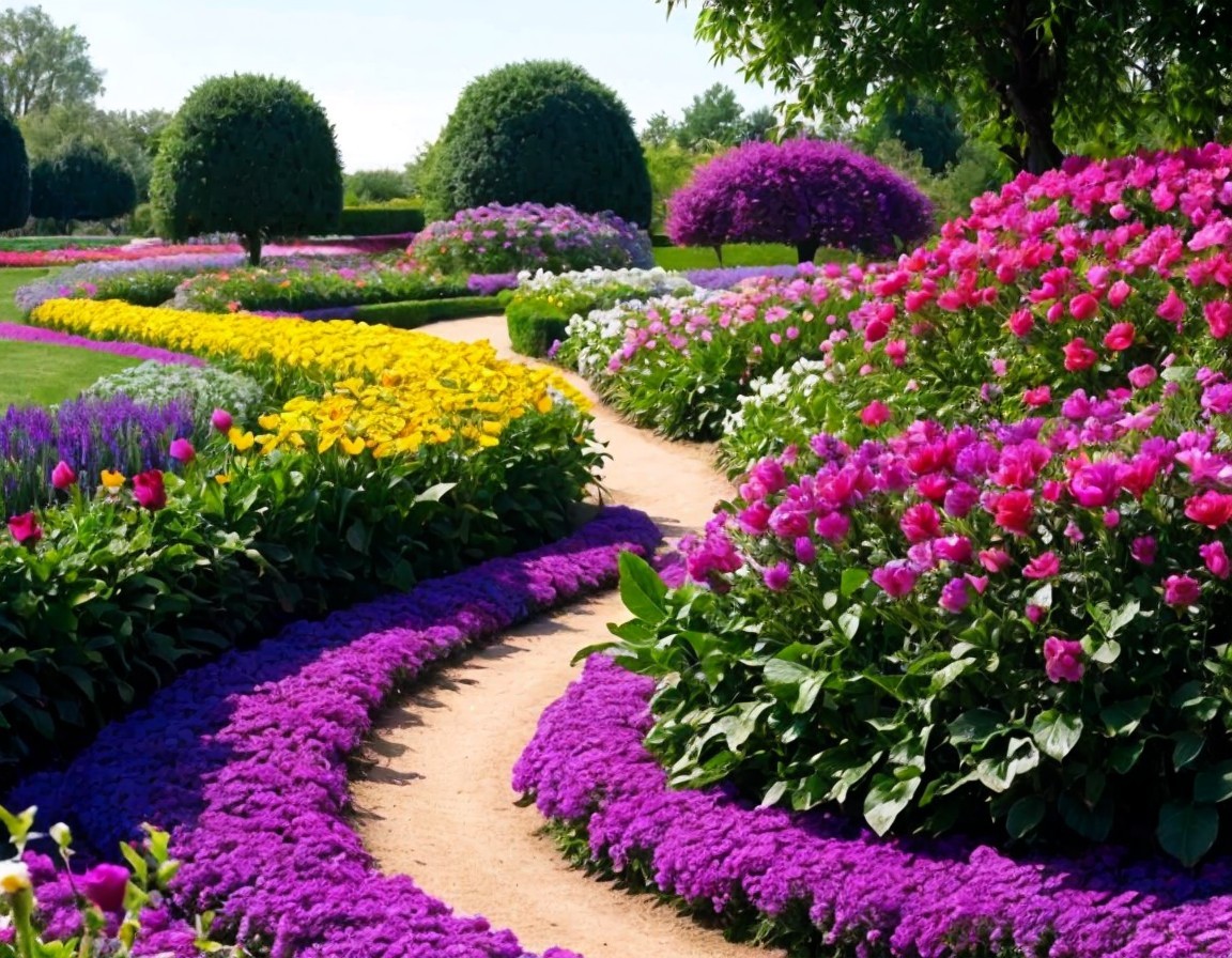 A vibrant bed of pink and cream roses with lush green foliage.