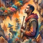 A young man with stylish hair stands in front of a vibrant, animated landscape featuring towering mountains, lush trees, and a serene waterfall, accompanied by travelers in the distance.