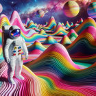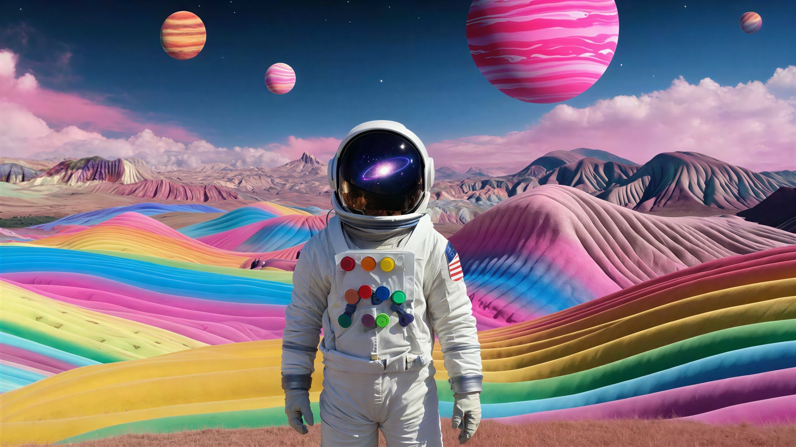 A full shot of an astronaut in a white suit, with an American flag patch on the sleeve standing in the middle of a surreal, colorful alien landscape, looking forward. The astronaut's helmet reflects a galaxy. The foreground is composed of undulating hills of yellow, blue, and pink. In the