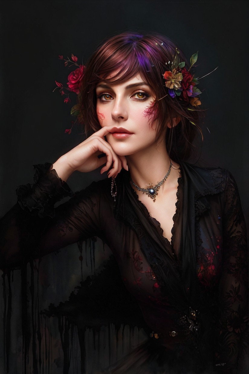 + Prompt:beautiful lady with gorgeous brown eyes, surreal, razor-sharp focus, a masterpiece, dynamic lighting, watercolour and ink, CARNE GRIFFITHS, Catrin Welz-Stein