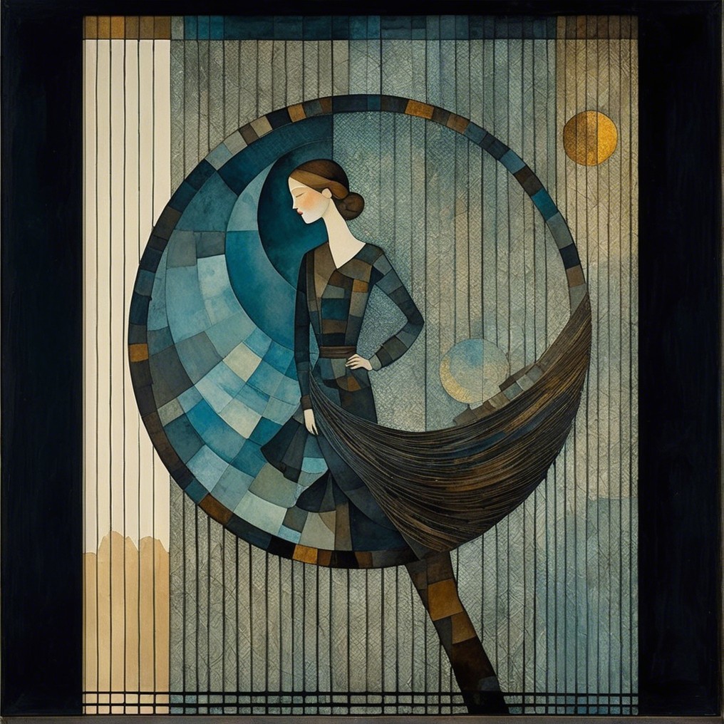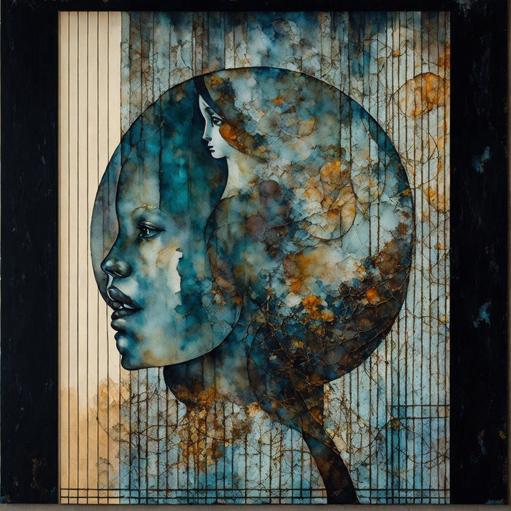 A captivating watercolor portrait of a woman, featuring soft hues and bold geometric shapes. She has large blue flowers in her hair and a serene expression, set against a stylized cityscape.