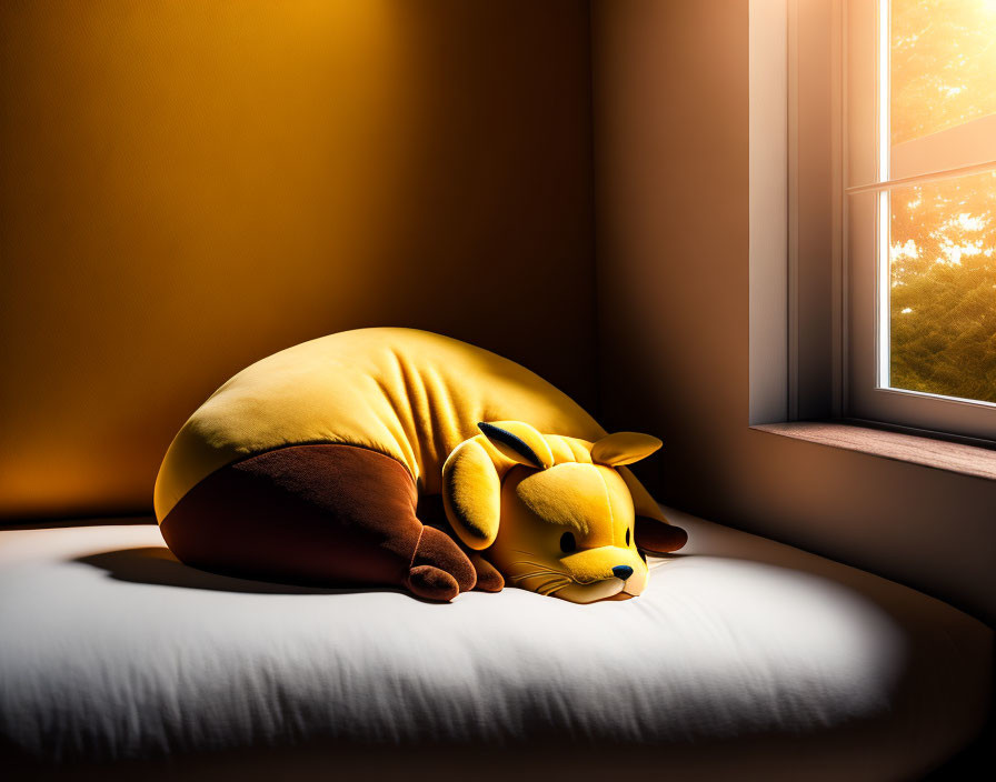 Brown Dog Sleeping on Cushion by Sunny Window with Plants: Warm, Golden Ambiance