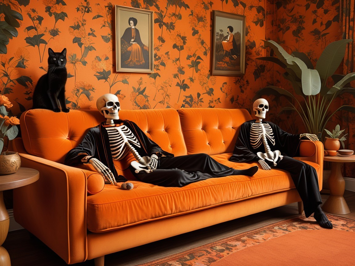 In a quirky, vintage-style room adorned with orange floral wallpaper, two skeletons in black robes relax on a vibrant orange couch, while a black cat perches playfully on the back.