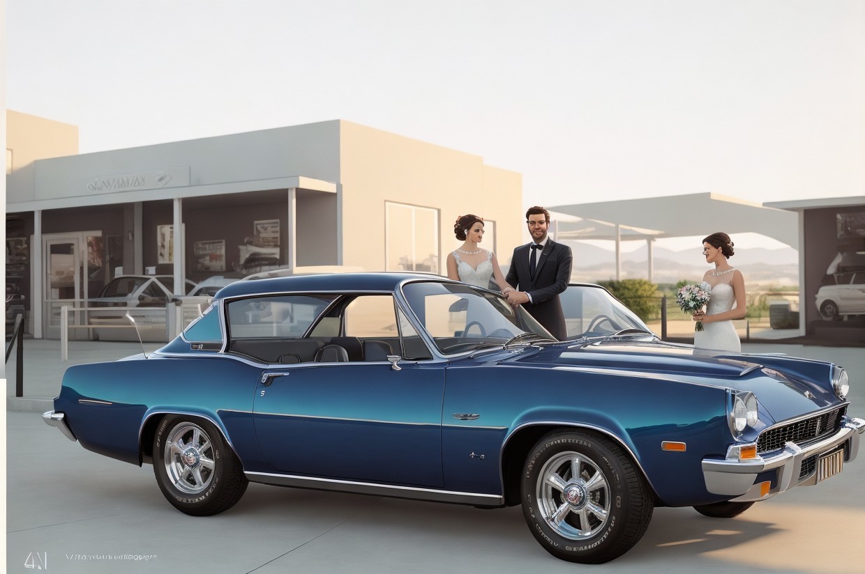 Elegant couple by a classic blue car, with a modern house and hills in the background, evoking luxury and nostalgia.