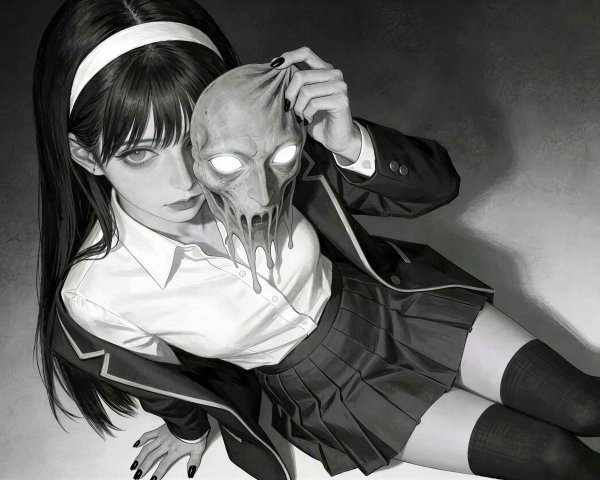 An anime-style character in a monochrome, gray-scale image, appearing as a schoolgirl with long dark black hair wearing a white headband, a white button-up blouse, a black blazer, a pleated mini skirt, and thigh-high socks. She holds up a skull-like mask with