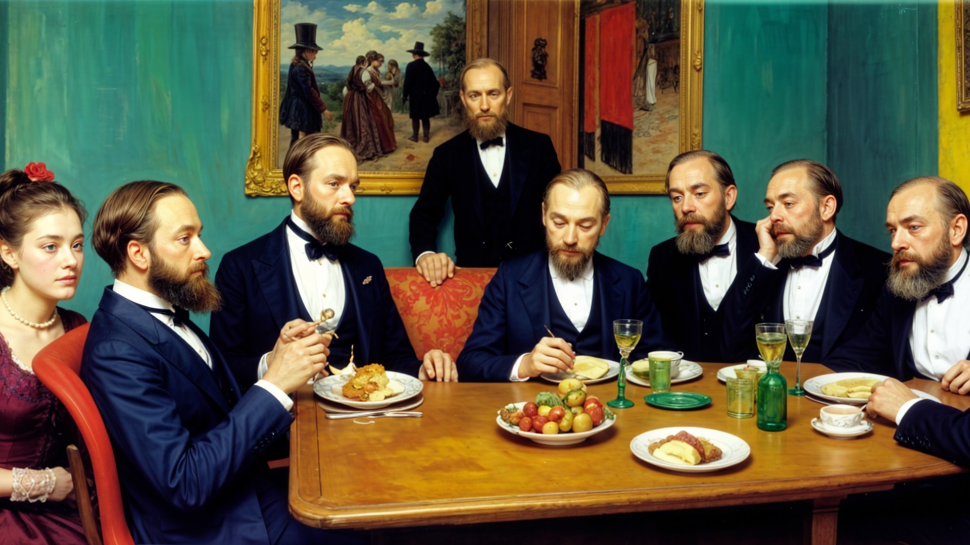 A group of four men with beards, dressed in tuxedos, sits around a wooden table adorned with plates of apples. They gaze thoughtfully at the viewer against a backdrop of a ship painting.