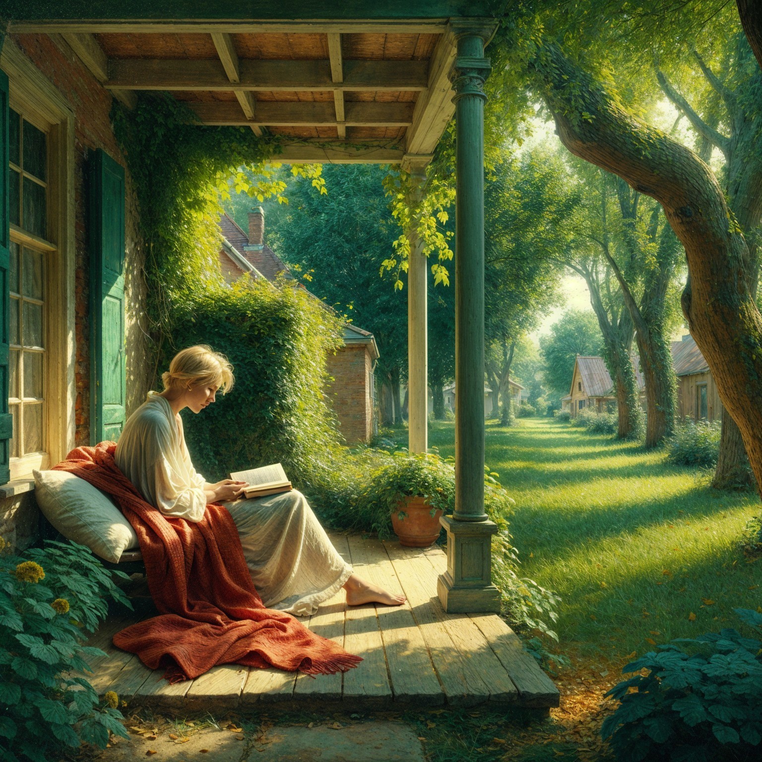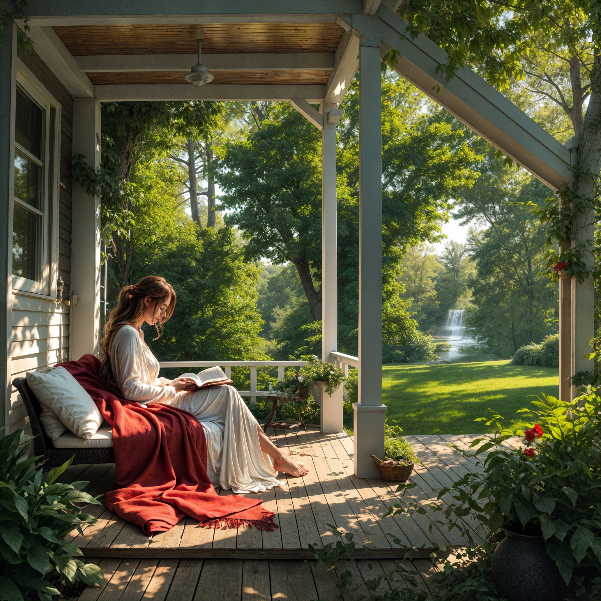 A serene scene featuring a woman seated on a porch, wrapped in a vibrant orange shawl. She reads a book, surrounded by lush greenery and the gentle sounds of a nearby waterfall.