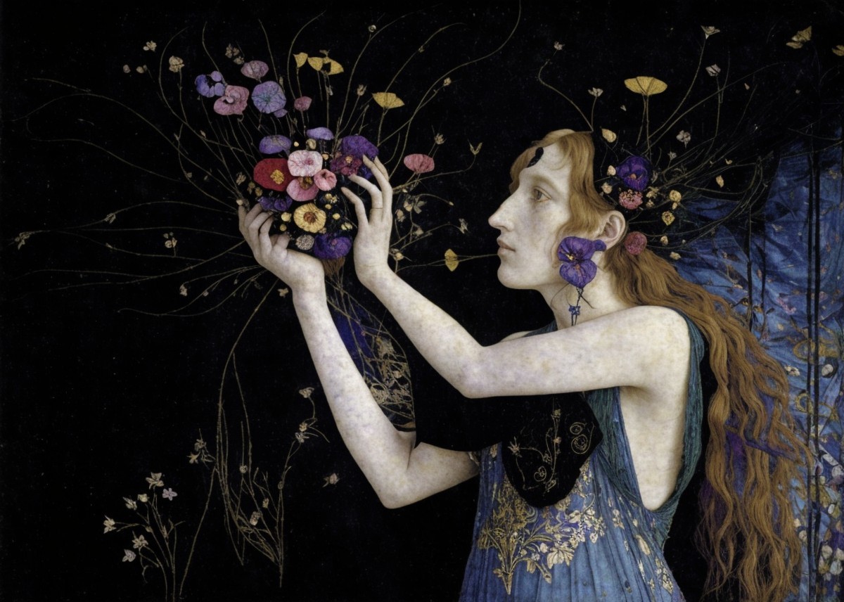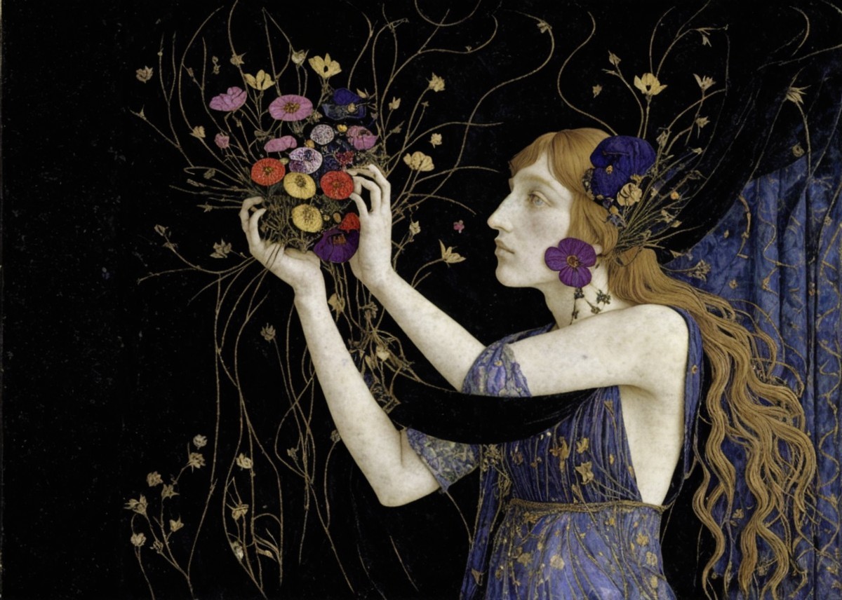 The image depicts a woman in a flowing blue dress, adorned with flowers. She gently holds a vibrant bouquet against a dark background, emphasizing the intricate details and colors of nature.