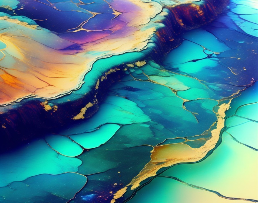 Vibrant, multicolored geological layers with turquoise pools, mimicking natural terraces in an abstract, artistic representation.
