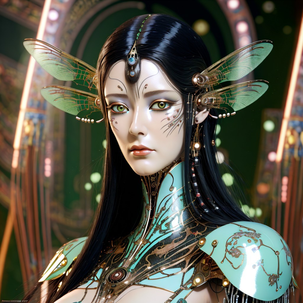 A mystical figure with butterfly wings and intricate jewelry, featuring green and gold hues. Her captivating eyes and elegant attire exude an enchanting, ethereal beauty in a vibrant setting.