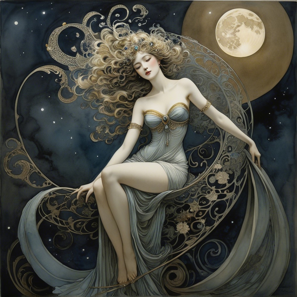 A graceful woman in flowing, ethereal garments dances under a full moon, her long hair styled with floral accents. The night sky is filled with stars, enhancing the enchanting atmosphere.