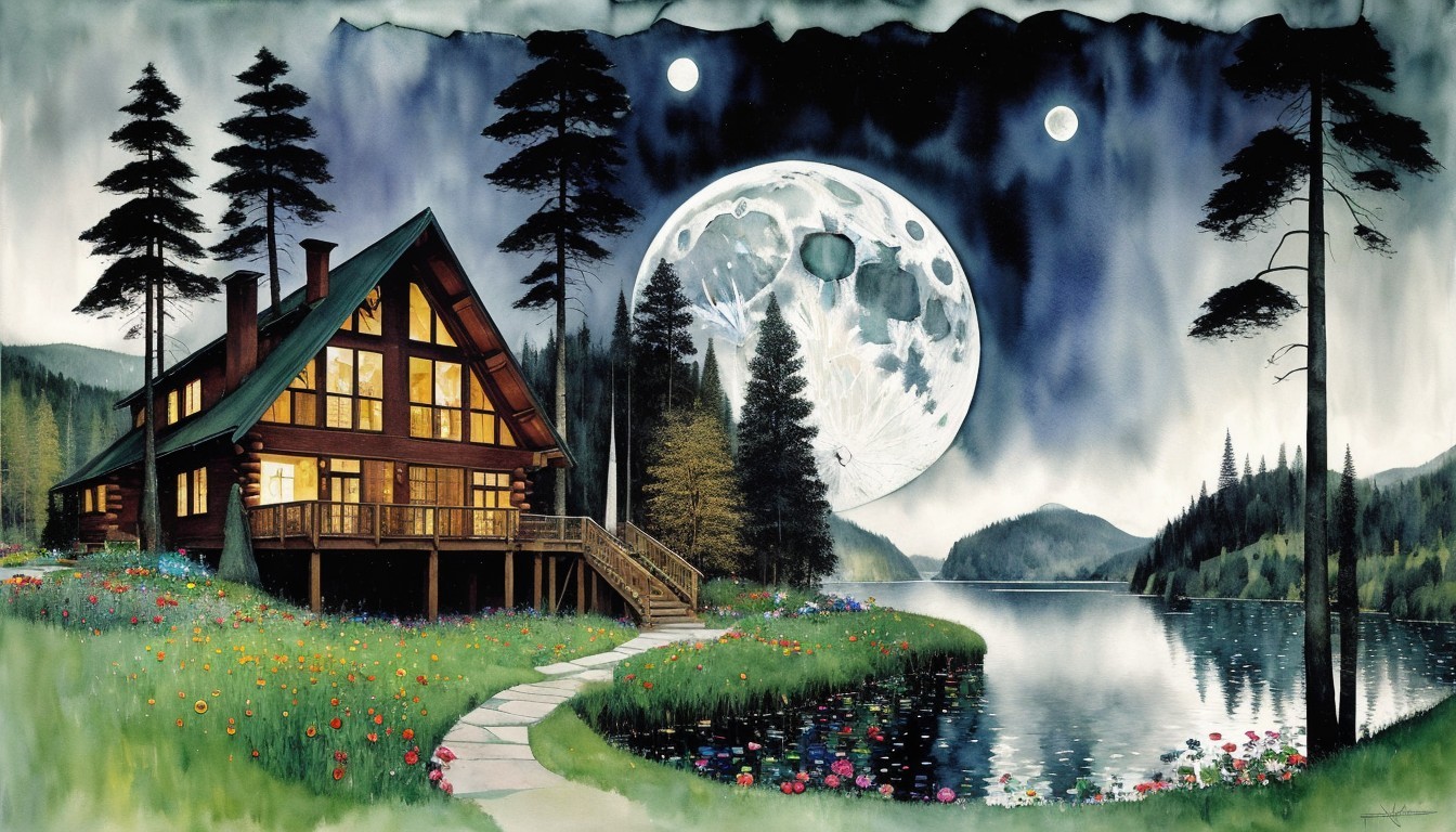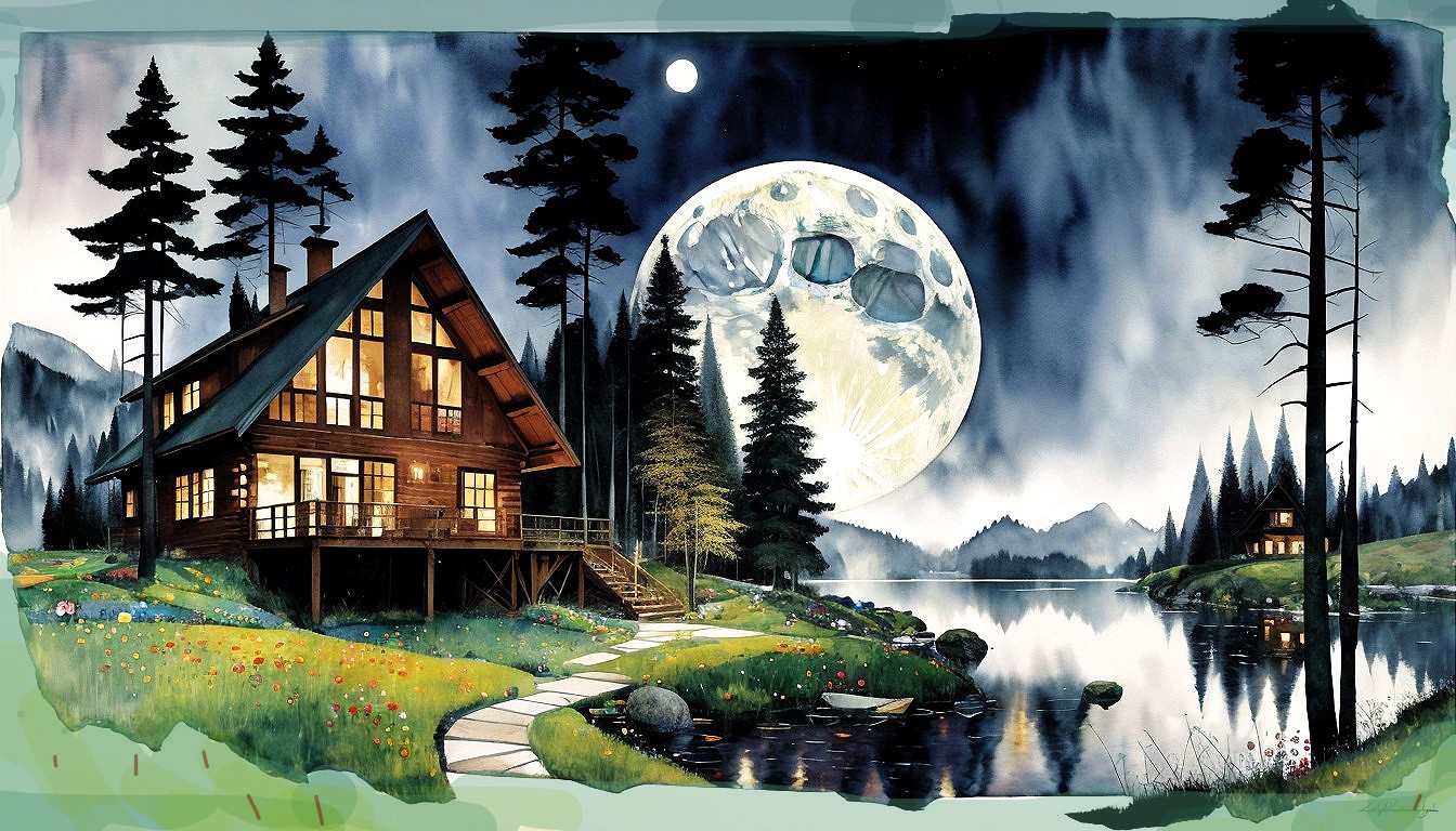 A scenic painting of a cabin by a lake, surrounded by trees, under a moonlit sky with a large, detailed moon.