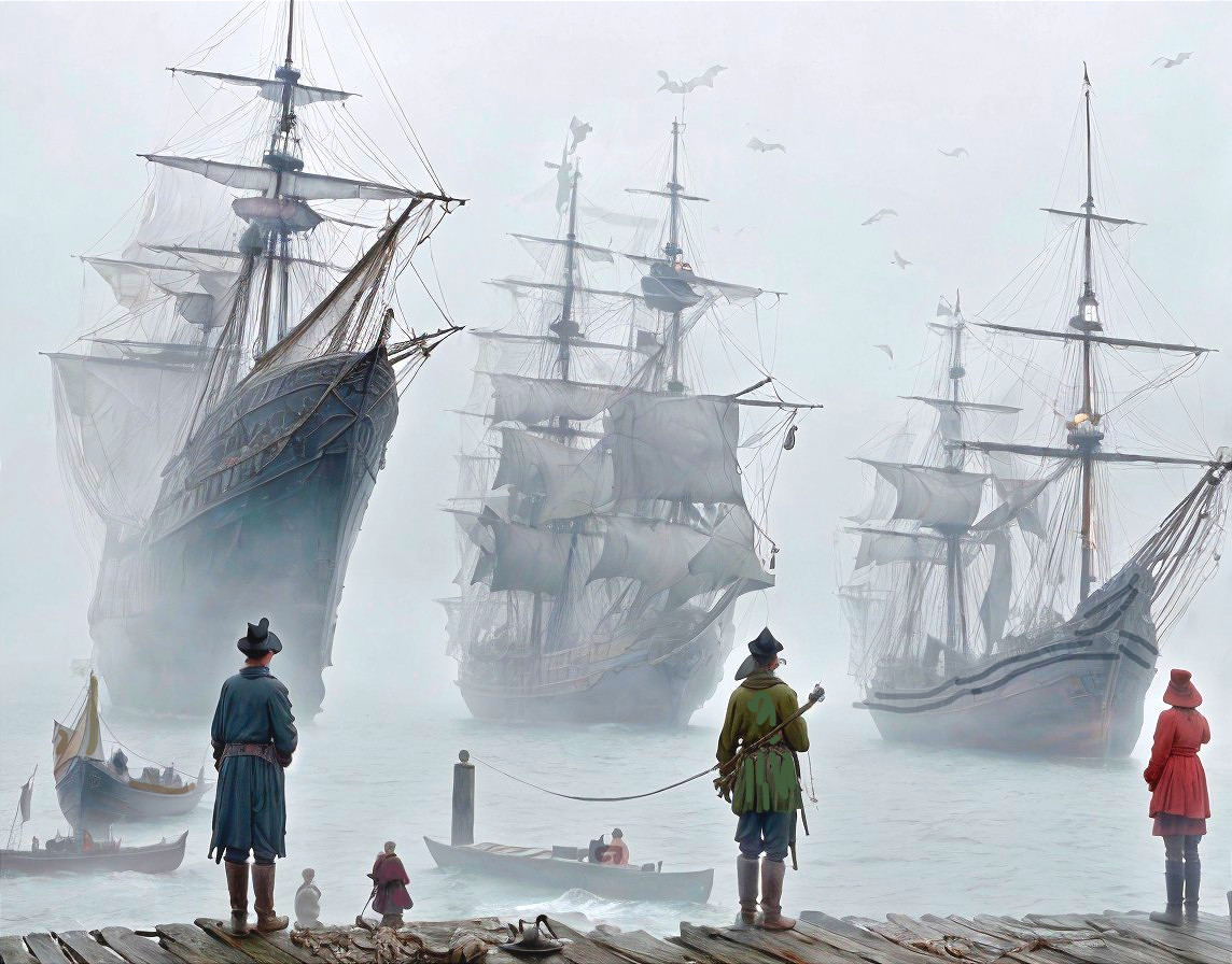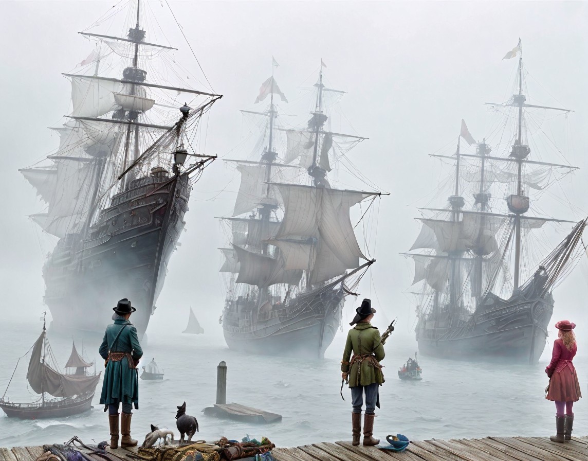 Prompt: 3D. Bright and colorful. Ghostly haunted ship with limply hanging sails, complicated rigging, anchored near shore, people running out of the water, eerie fog, mysterious atmosphere, colorful figures in baroque clothing stand at the front of the wooden brown bridge, detailed rigging, dark and ominous mood and foggy surroundings, inspired by Anton Pieck