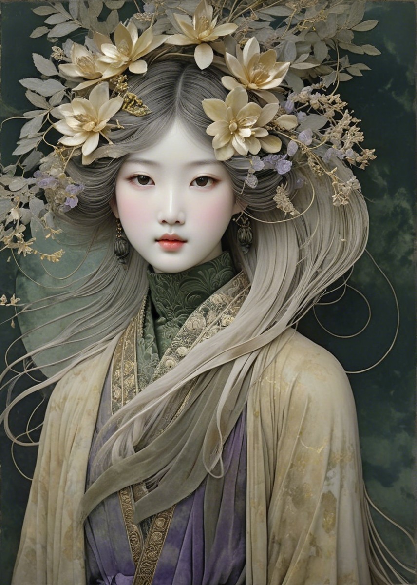This elegant portrait features a woman in traditional attire, adorned with floral decorations in her hair. Her serene expression is complemented by intricate patterns and soft colors in the background.