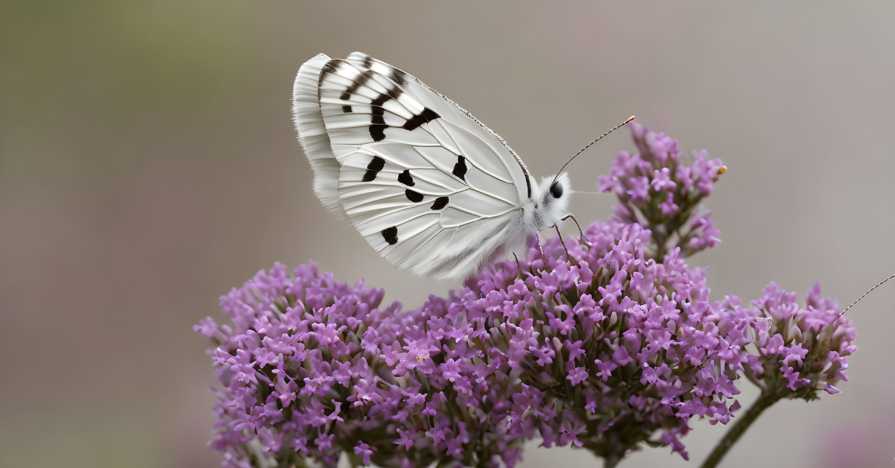 A macro illustration of a small whitish butterfly with colorful speckles on a purple blooming flower in a tranquil garden of perfect joy and infinite unbounded happiness, ultra detailed, 8k, intricate, elegant, peaceful, harmonic colors, precise, exquisite, nuanced, complex, photo-realistic, immersive, extremely detailed, digital painting.