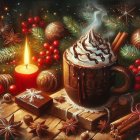 A cozy holiday scene featuring a cup of hot cocoa topped with whipped cream, chocolate drizzle, and a cinnamon stick. Surrounding it are festive decorations, including berries, a candle, and ornaments.