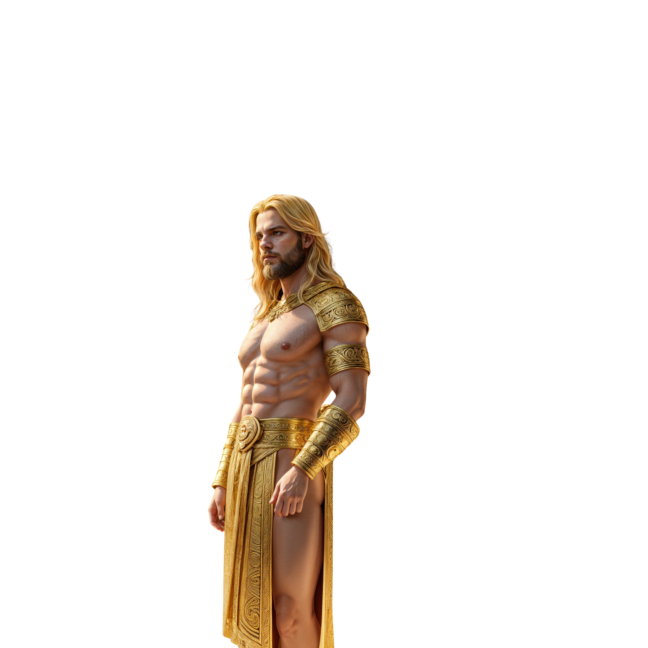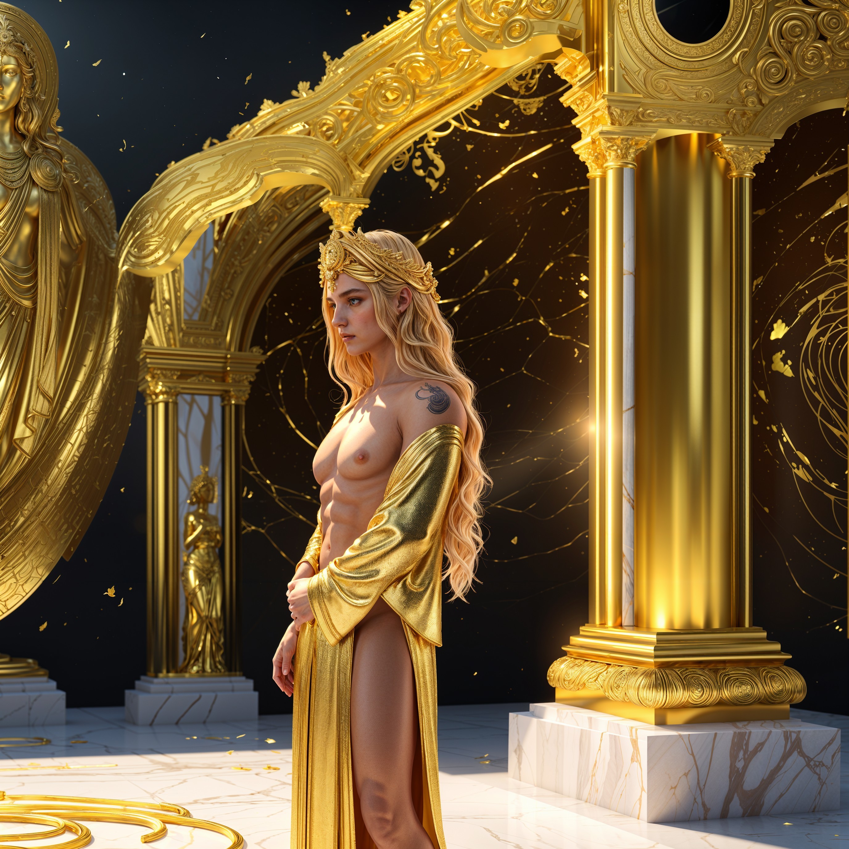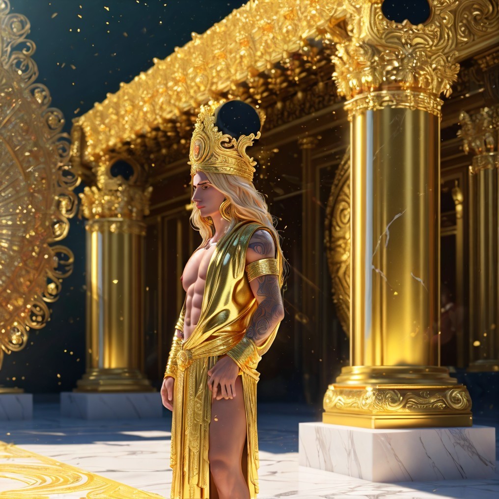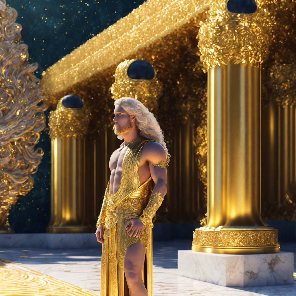 A muscular figure in a golden toga stands in a grand, ornate hall lined with marble columns and statues. The scene exudes ancient Greek grandeur and divine majesty.