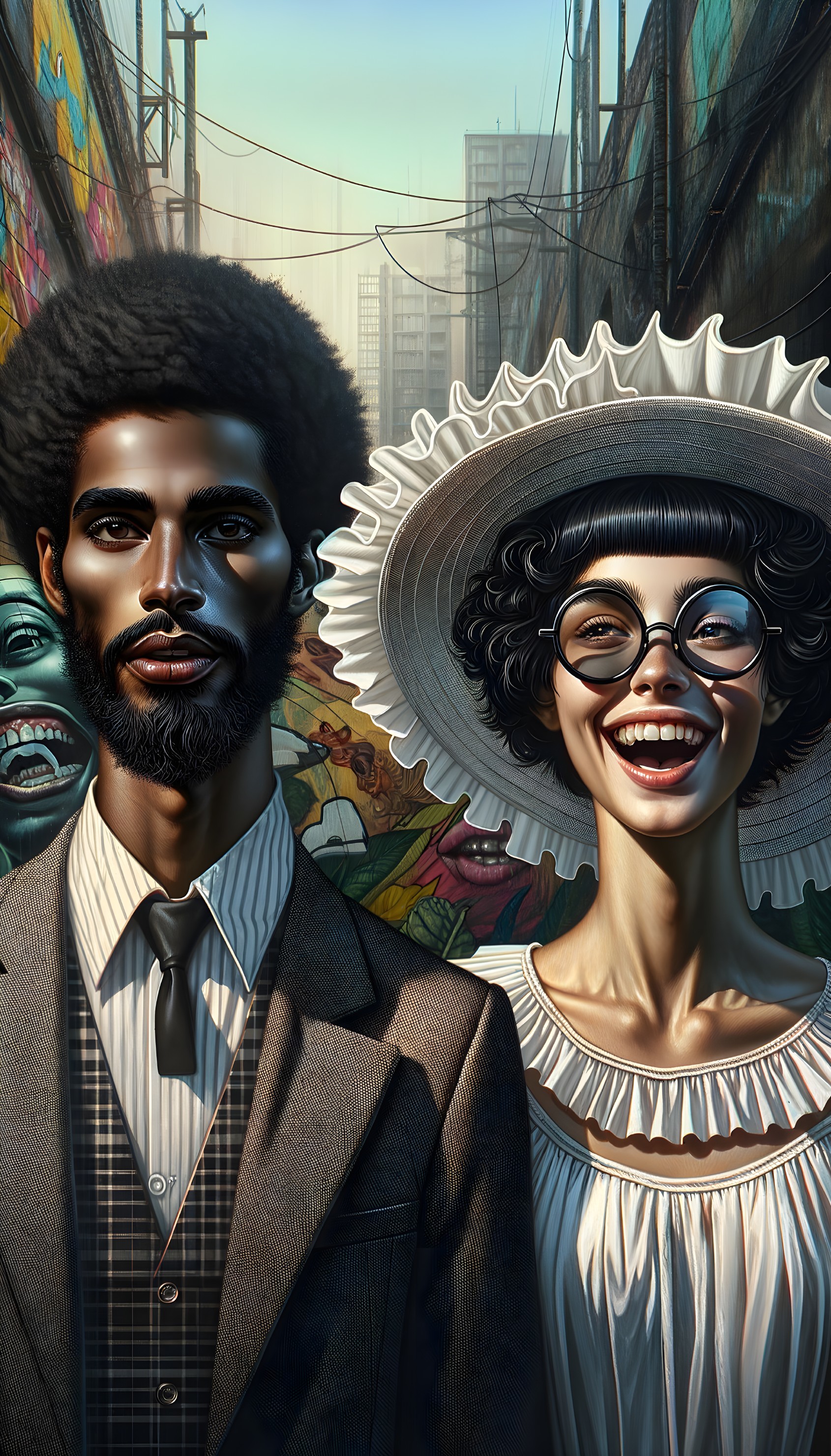 A stylized illustration of a couple with exaggerated features and retro fashion in a bustling urban setting.