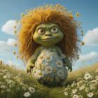 A cheerful, furry green character with a whimsical, flower-adorned hairstyle stands in a sunny field filled with daisies, smiling brightly against a backdrop of fluffy clouds.