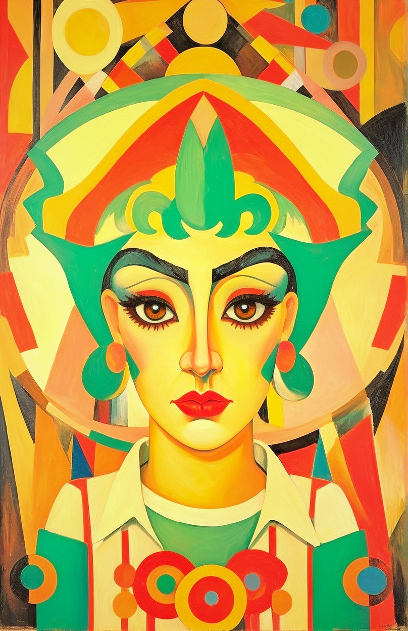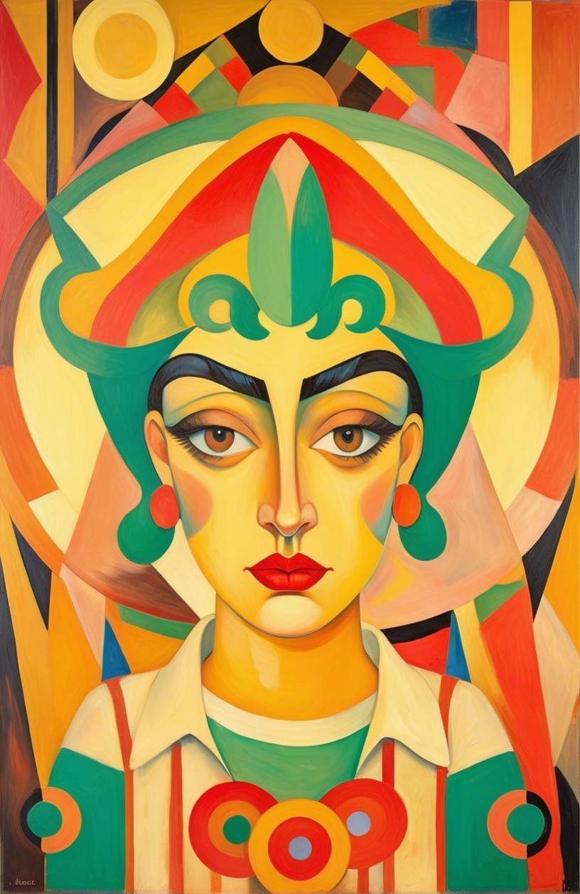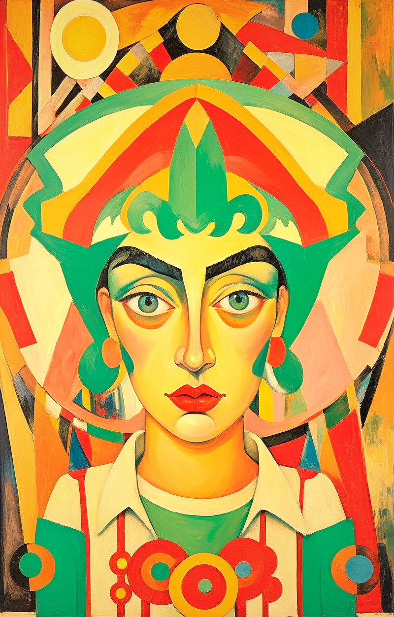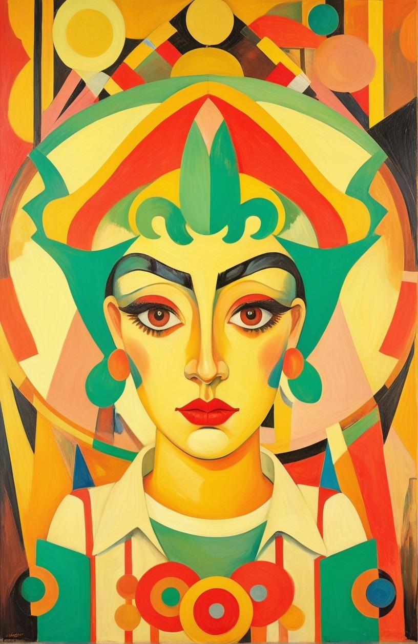 Prompt: Upper body portrait, vividly blend the essence of Chaim Soutine, Caia Koopman, hues by Antoni Tapies, and Arshile Gorky into a hyperreal masterpiece. Infuse the style of Bauhaus seamlessly with streamline_moderne architecture, plasticity 1.3, psychosomatic surrealism and psychedelic postimpressionism in a surreal composition inspired by the works of Ho baron and Francesco Clemente. Incorporate the raw, lavish textures reminiscent of Tanya Shatseva and Raimonds Staprans, with a touch of avant-garde art by Stevyn Llewellyn. Embrace the essence of Keiichi Tanaami's warm colors and merge it with the dreamlike quality of generative patterns with soft edges, only curves and bended linework, subtle visble watercolor textures, warm tones, high coloring, colorful wet-on-wet technique, simplistic, blotting quill pen used for embossed hues by Jackson Pollock, warm 3 point lighting, visible textures, stylized woodblock print by Overton Loyd, hatching, ink and a scratching style, chiseled, plasticity 1.2, sgrafitto style, anthropomorphized, weird, chibli, custom_loss: edge, mental, strict, asymmetrical composition with flowing light, slightly warped, parallax occlusion, foreground with a plasticity 1.7, abstract brushstroke art, asymmetrical elements, warm coloring, retro-futurism and touch of american gothic, emphasizing shadows and highlights, tousled, delicate tones in a indiecore style, intricate and complex line-art, asymmentrical geometrical 3D effects, great depth and scale, linocut by Brock Hofer,raytraced shadows 1.1, only curves, stacked lines, champlevé method, layered hues by William Bradley, dynamic lighting 1.7, VFX-inspired softened lighting, brightness 1.3, infused with a 1960s retro design twist akin to op-art inspired by Georges Seurat and Man Ray. Incorporate intricate patterns,