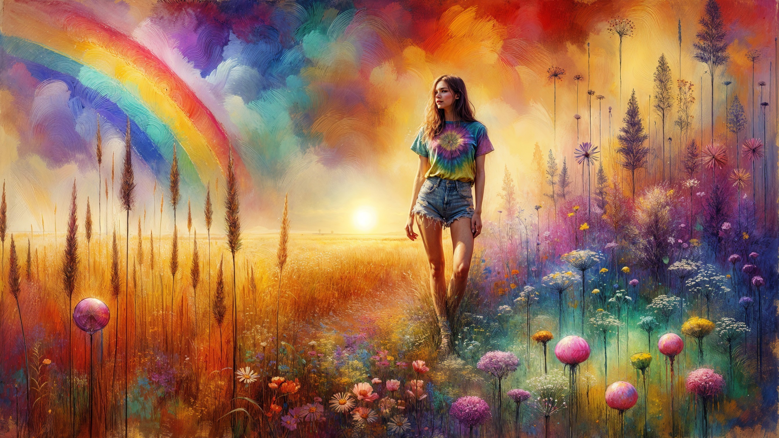 Prompt: "Create an image of a distinct tall young Bohemian woman, wearing shorts and a tie-dyed tee-shirt, standing in a field of tall grass, wildflowers, and pink lollipops against a vibrant, abstract background with a SMALL rainbow in the FAR distance. The background should transition from (watercolor flowers and grasses in the foreground at the bottom), through (richly detailed acrylic rendering of the woman in the mid ground), to a background consisting of a (SMALL rainbow rendered in oil with vivid colors ranging from bright yellow to deep purple, using impasto technique with medium palette knife.) Over all feeling is one of wonder and amazement."