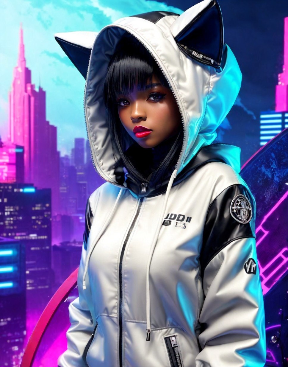 Prompt: "3D anime-inspired desktop background featuring a cool hip-hop girl in black attire with a white cat peeking out of her hood, adding a playful touch. The scene is set in a futuristic sci-fi style, with intricate details and vibrant colors, making it a captivating and trendy wallpaper option for any device. The girl exudes a modern and urban vibe, while the cat adds a whimsical element, creating a unique and eye-catching composition."