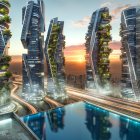A futuristic skyline features sleek, curving skyscrapers with illuminated facades, set against a vibrant sunset. Reflective water enhances the modern architecture, creating a stunning urban scene.