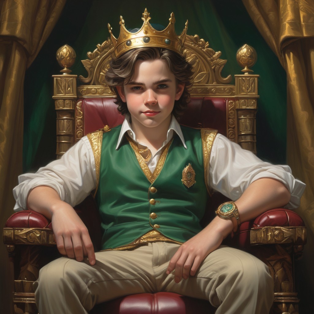 A rakish king slouched lazily on a throne looking at the camera, lazy and mischievous smile on his face, by Craig Davison, by Isaac Rosenberg, Kenyon Cox, detailed face features, sharp emerald eyes, taut golden skin, concept art, portrait, detailed, sharp, high definition, award winning, photorealistic, organic, painstaking attention to detail, irresistible, overwhelming, polished, delightful, marvelous, graceful, glorious, very stylish, trendy, spectacular, tantalizing, exceptional, charming, very attractive, amazing, splendid, intriguing, handsome, elegant, mesmeric