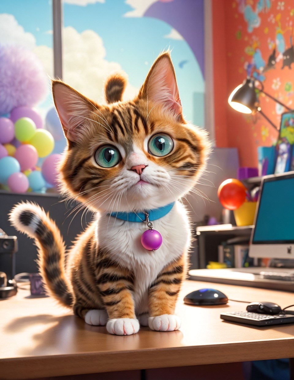 Prompt: "151515:[An artistic interpretation of a cat in Pixar style, reminiscent of Furrball from Loony Toons, works in the office . The scene is set against an inspiring, colorful, and vibrant wallpaper, creating a whimsical and relatable atmosphere]{hi-res, photorealistic, Nikon Z9, 85mm F1.2, DOF, smooth and realistic HDR}"