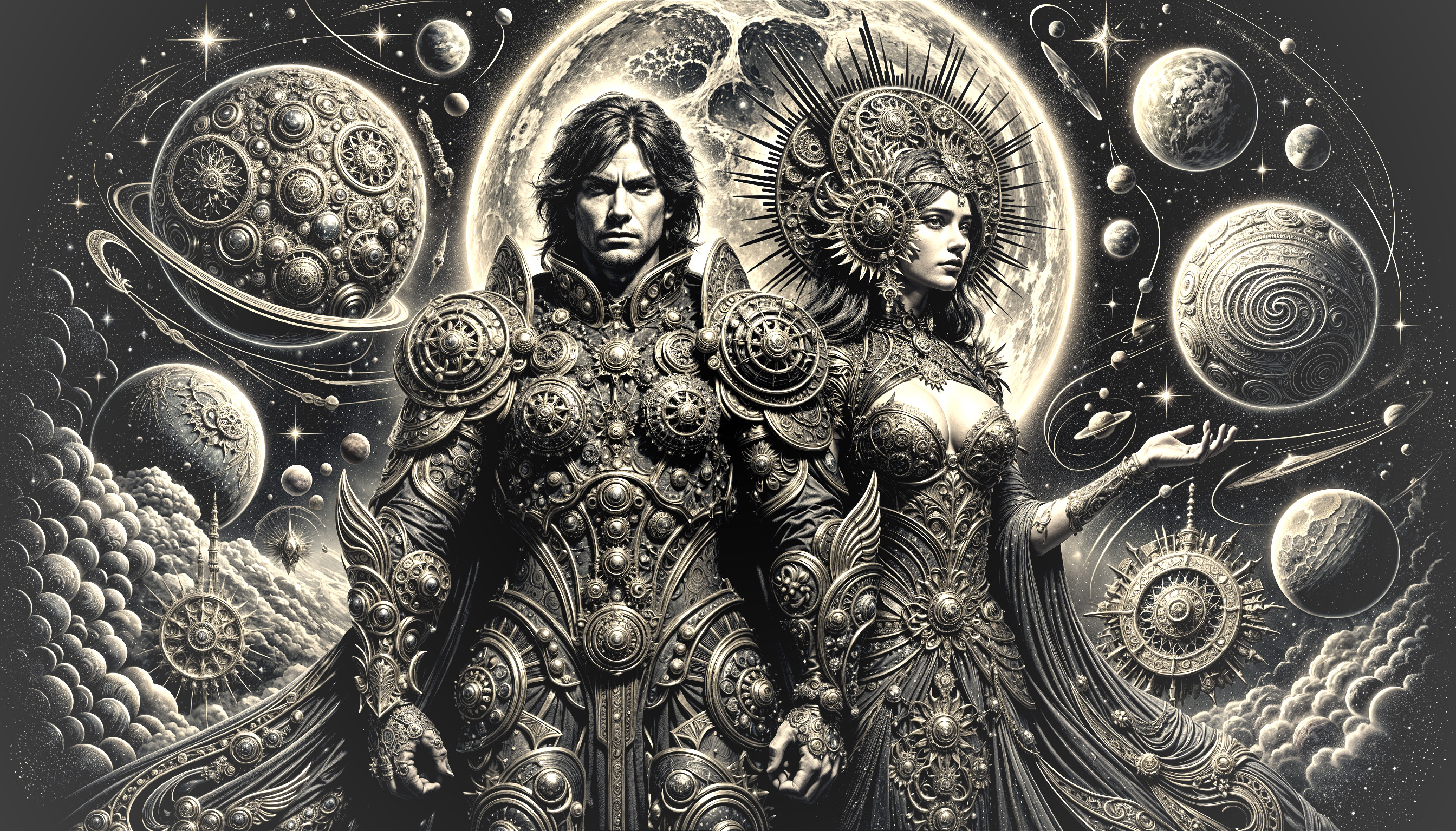 An elegant and detailed illustration of two celestial beings in futuristic armor, blending steampunk, dark fantasy, and sci-fi elements. The characters exude nobility and power against a cosmic backdrop of planets, stars, and moons, creating a mythical and technologically advanced atmosphere in monochromatic shades.