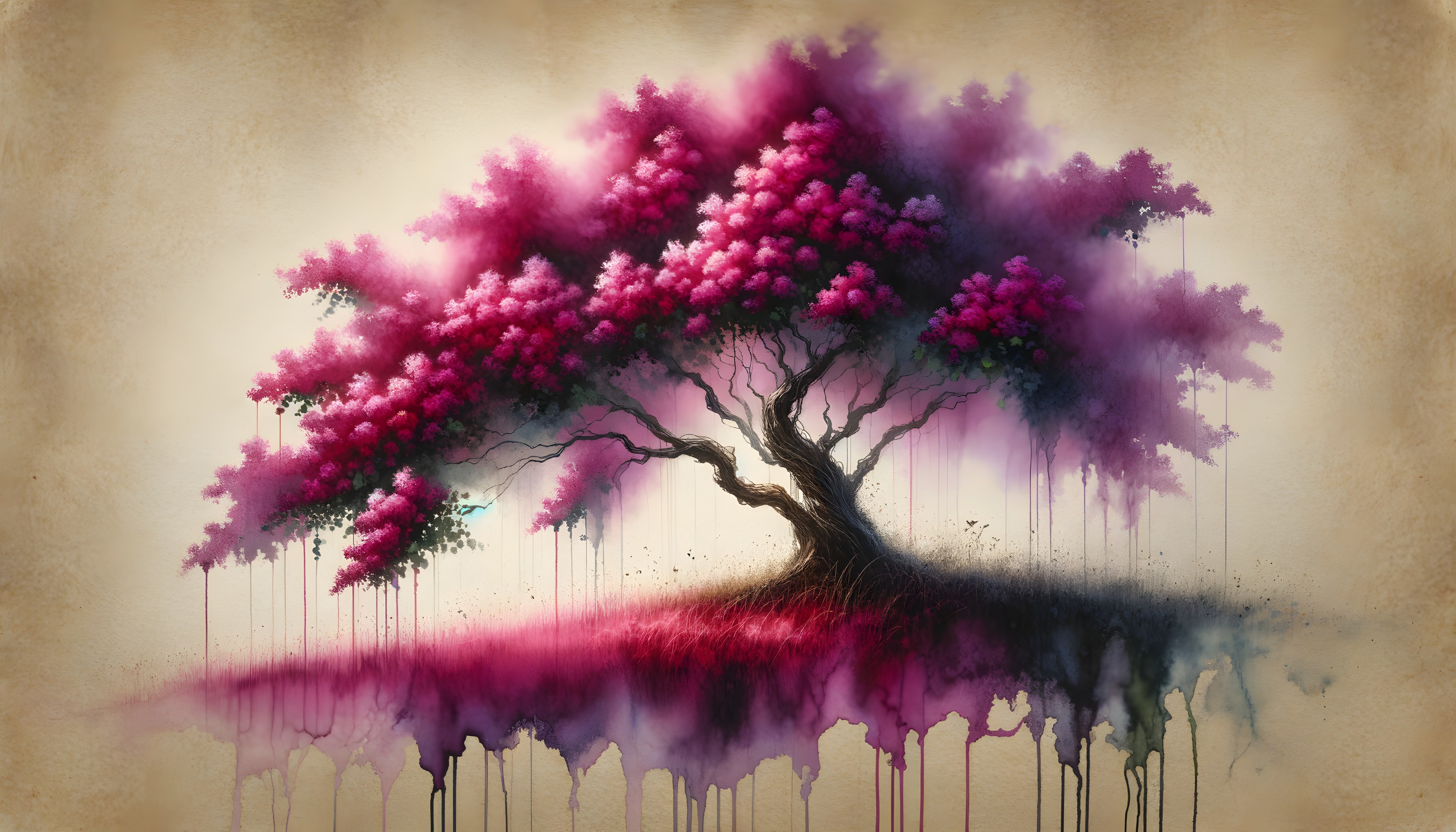 A surreal painting of a vibrant purple-pink tree with dripping colors against a warm, textured backdrop.