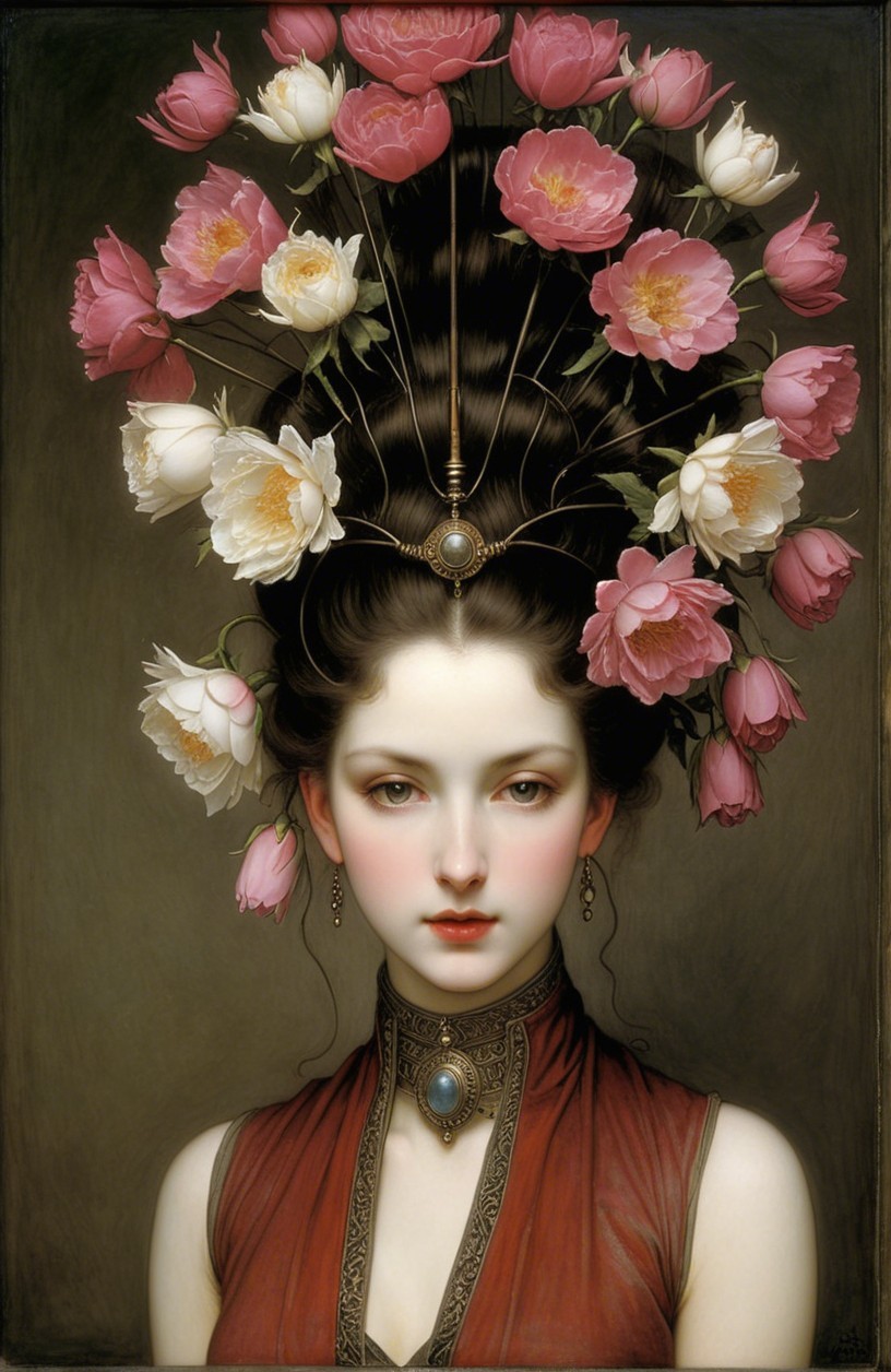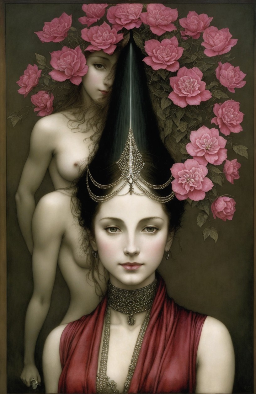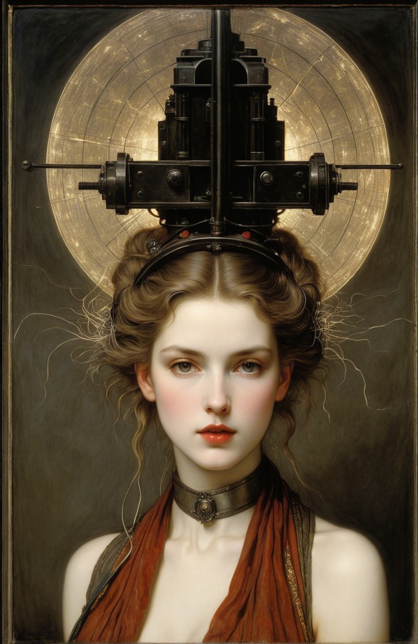 A elegantly rendered figure of a woman stands in profile, adorned with flowing dark hair and a serene expression, framed by a luminous circular halo, evoking a sense of beauty and grace.