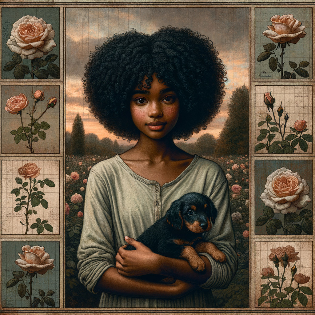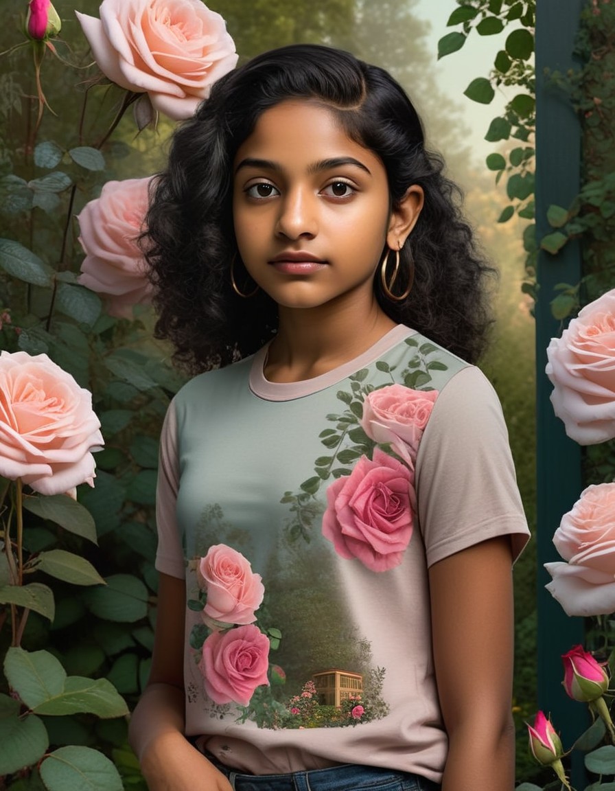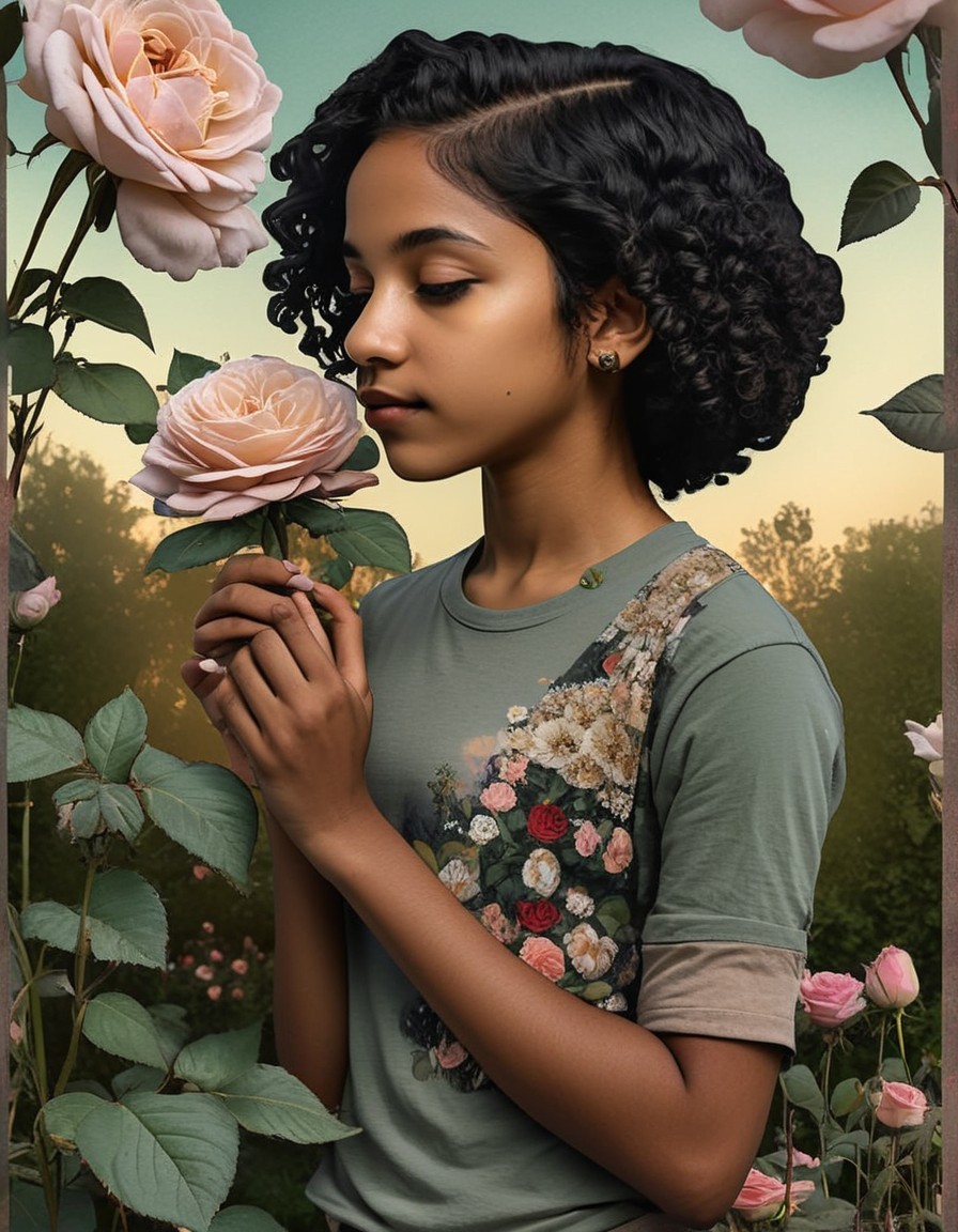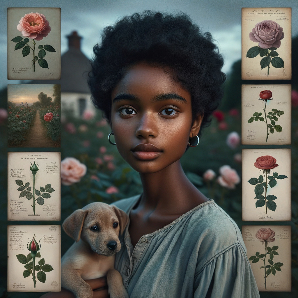 A composite image of a girl with different expressions, framed by blooming roses, against a serene garden backdrop.