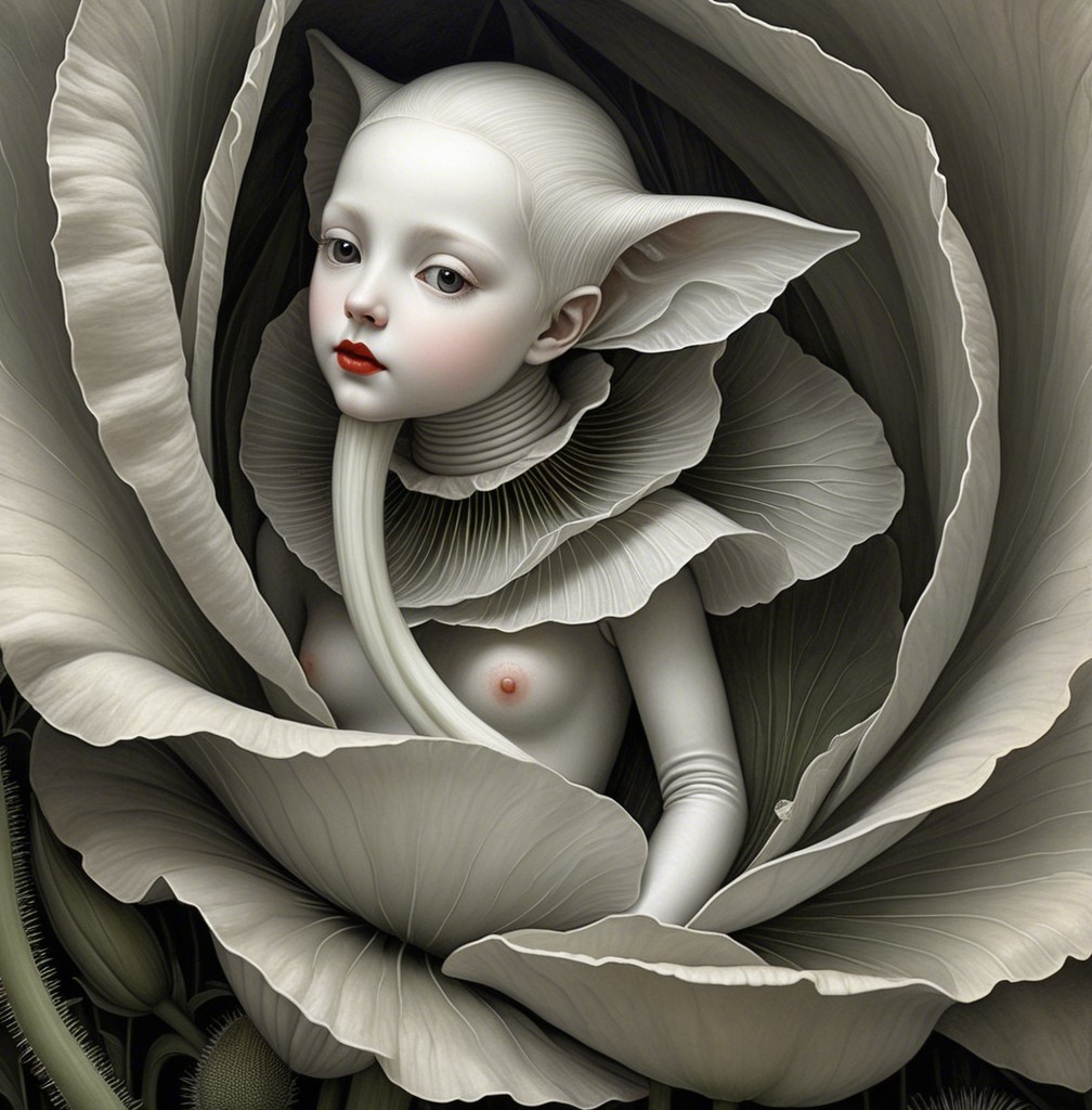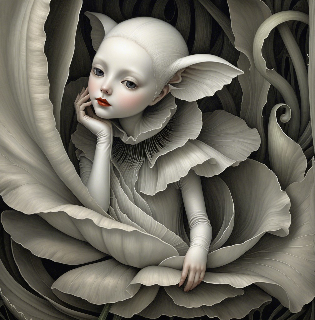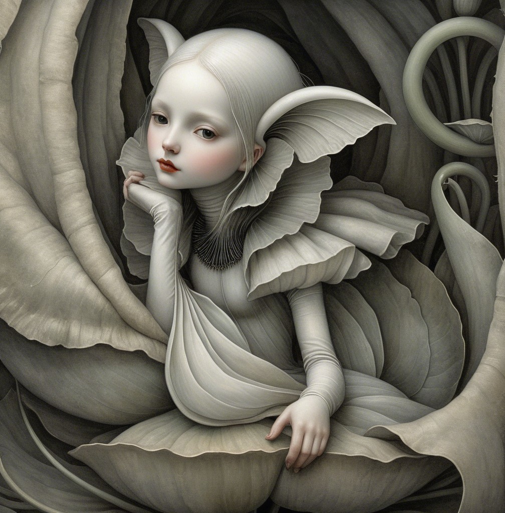 A whimsical, ethereal girl with pale skin and striking red lips peers through swirling, gray leaves. She wears a textured, ruffled collar, merging human innocence with nature's elegance.