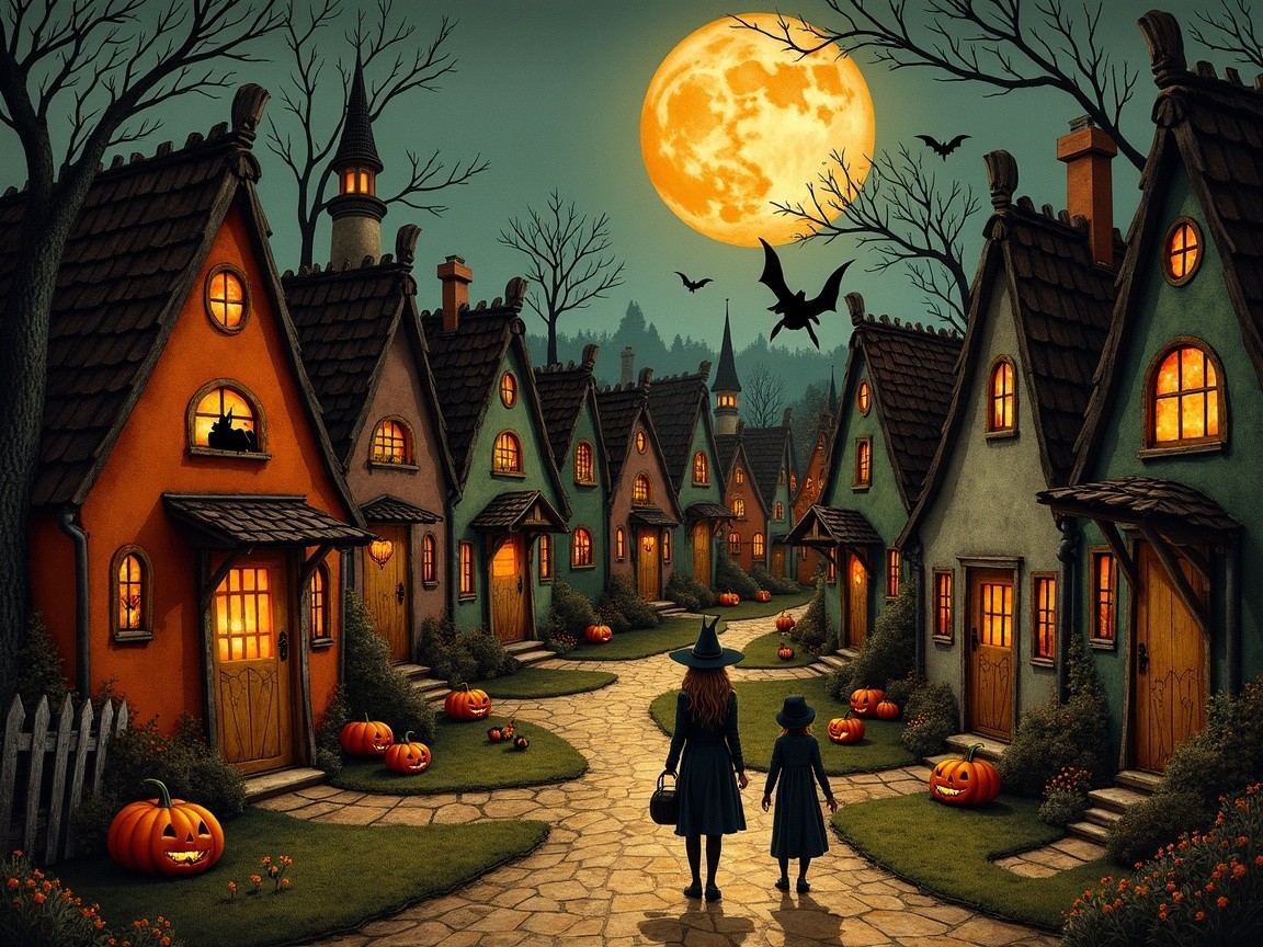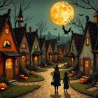 A little village under a full moon features cozy, welcoming homes and carved pumpkins. Silhouetted figures in costume stroll down a winding path, deciding which house to go to next.