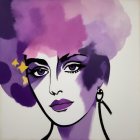 A minimalist yet expressive portrait blending ink precision with watercolor diffusion. Violets and lilacs swirl around a poised feminine face, defined by clean black lines and softened shadows. The golden details in earring and flower balance the cool chroma with warmth, suggesting serenity, confidence, and mystery—where fashion illustration meets emotional abstraction.