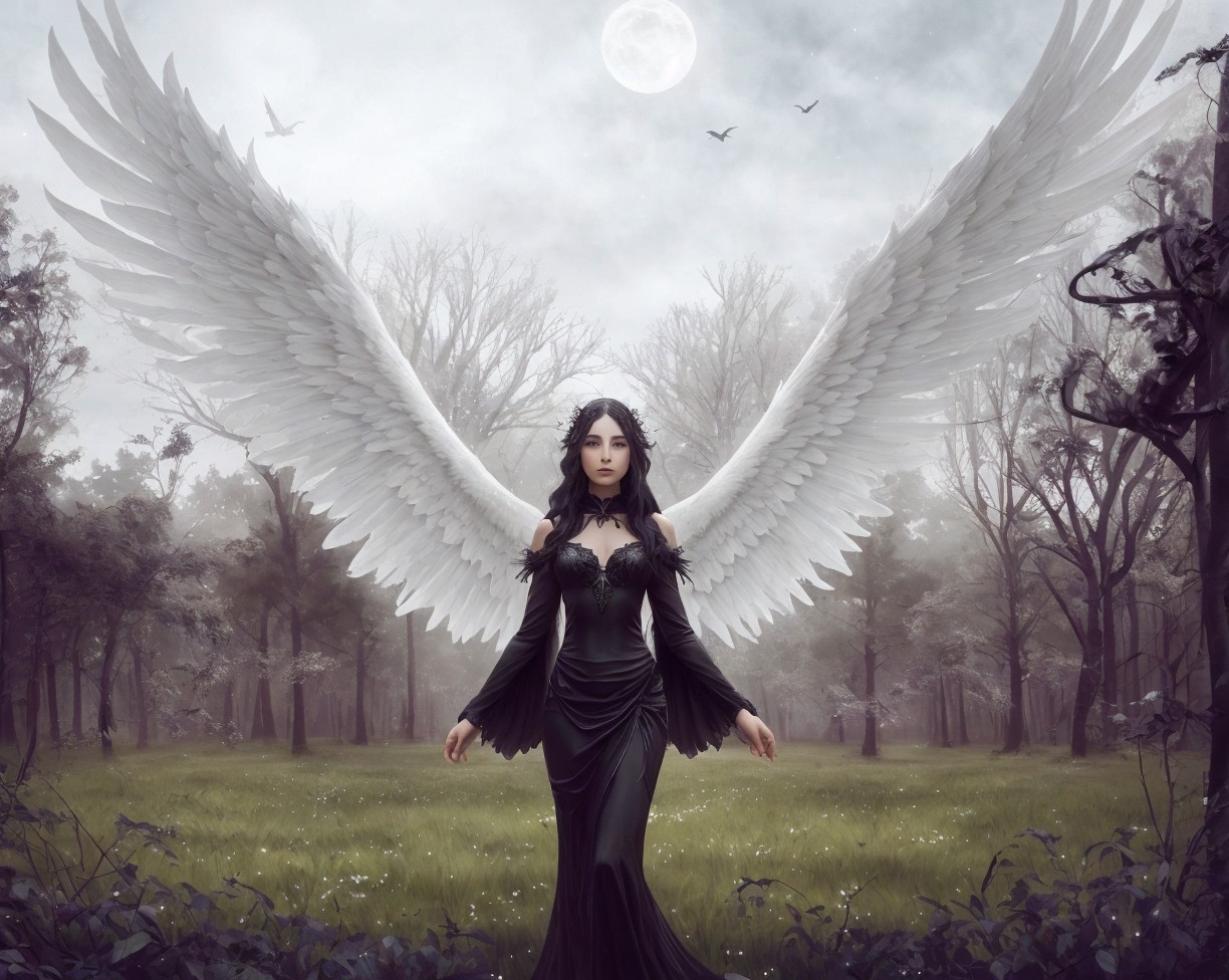 In a serene forest under a full moon, a woman with large white wings stands gracefully. Dressed in a flowing black gown, she radiates an ethereal aura, surrounded by delicate greenery and distant birds.