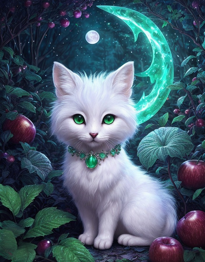 An intricate and detailed fantasy painting featuring a cute chibi ghost creature in a magical forest setting with swirling smoke, a red moon, apples, and filigree details, all brought to life in a dynamic and surreal composition.