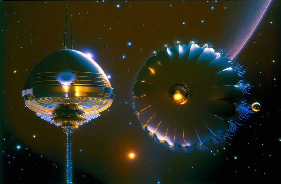 + Prompt:silvery interstellar probe with solar sail set against a background of deep space. probe is shiny and metallic. probe resembles a dandelion seed head; anemochory; robert mccall