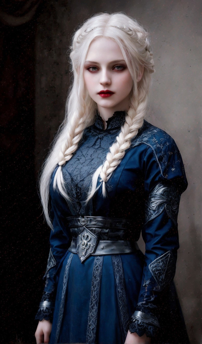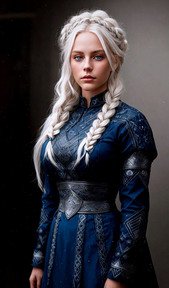 Prompt: "Full body portrait, London 1890, 23-year-old Norse beauty Astrid has platinum blonde hair that falls in gentle waves past her shoulders, often braided with intricate patterns symbolizing her heritage. Her azure eyes resemble the cold Northern skies, etched with a determination that reflects her warrior lineage. Standing taller than most women of her time, her stature is both imposing and graceful, with an aura of noble defiance."