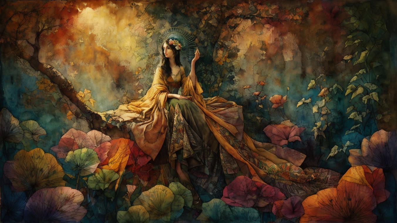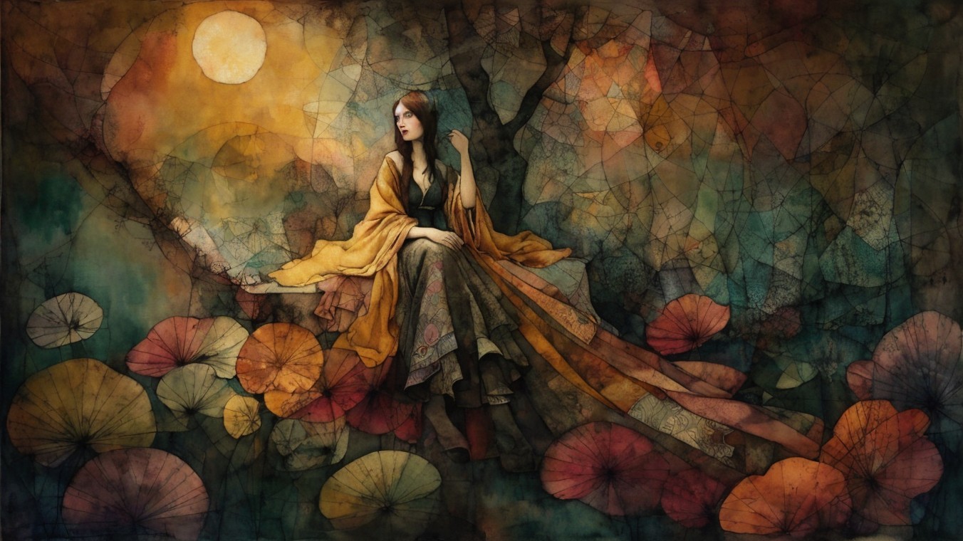 A serene woman in a flowing orange dress sits among colorful abstract shapes, reflecting a tranquil landscape with soft colors, while a gentle moon illuminates the scene.