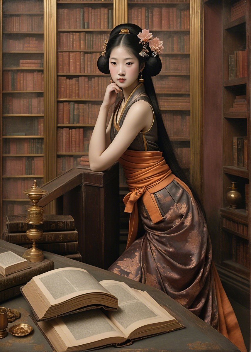 Girl in her library, 3rd century Chinese miniature art, Velvet blush copper, peach Shabby, Dull Gold, Amber Gray, marbled. dramatic