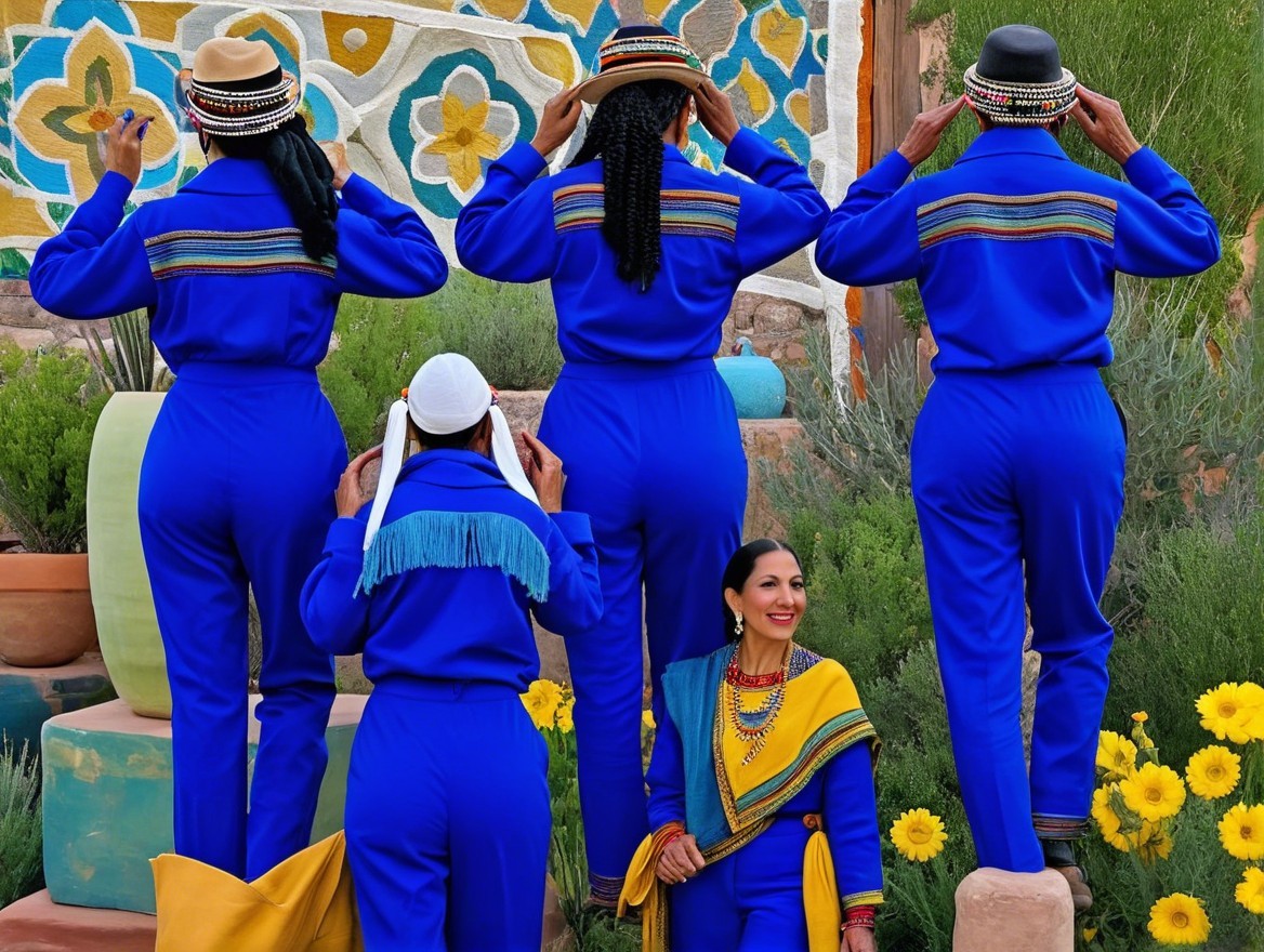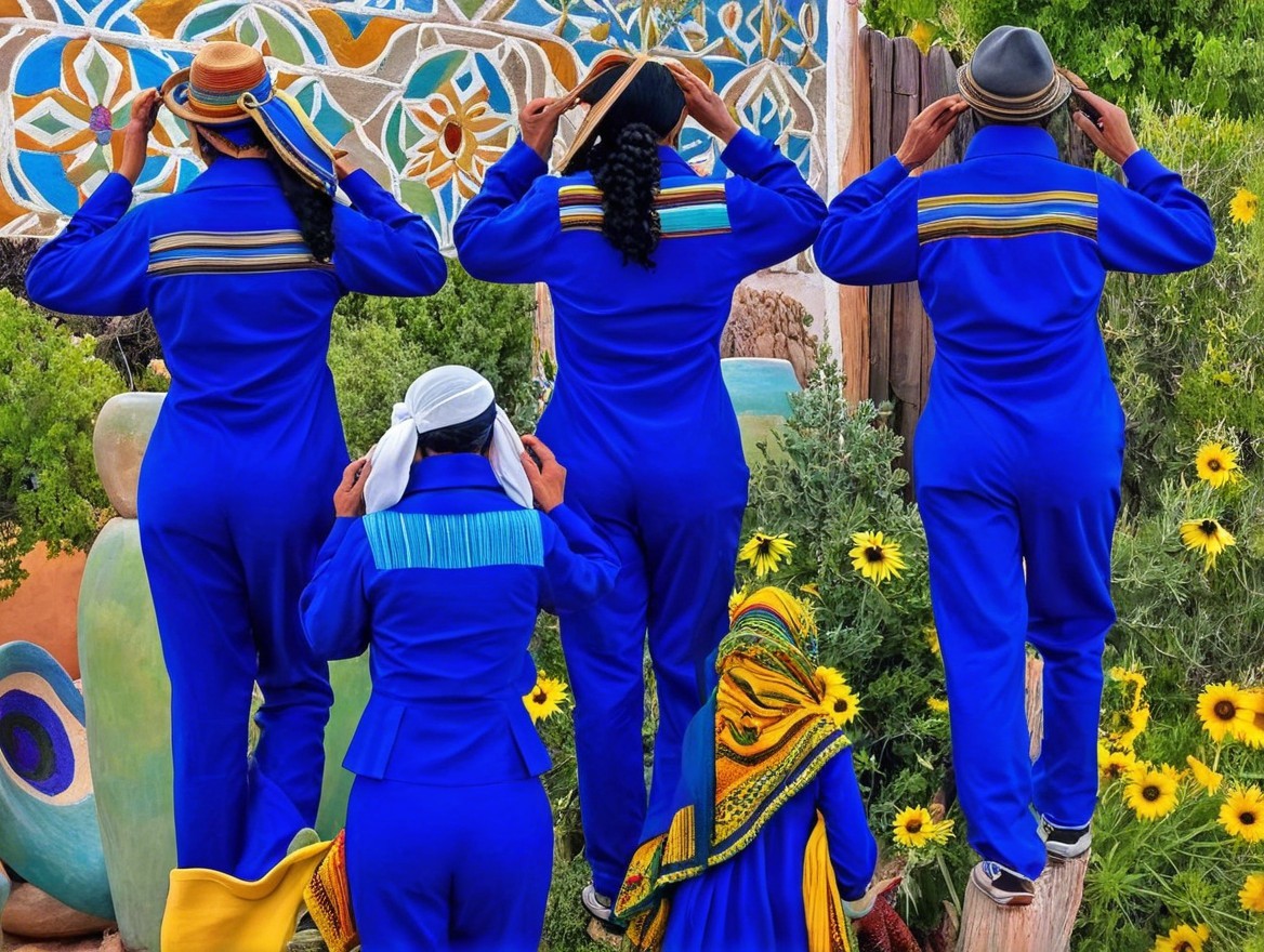 A group of five individuals, dressed in vibrant blue outfits and hats, performs a coordinated gesture against a colorful backdrop of tiles and lush greenery, with bright flowers nearby.