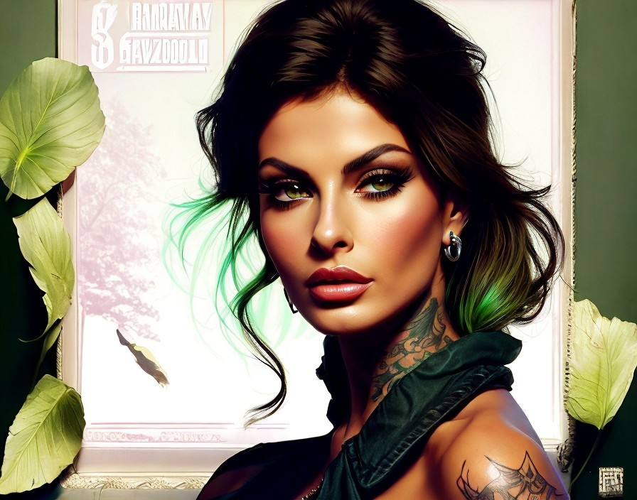 Two stylized women with prominent tattoos; one in the foreground with brown hair, the other a reflection with white hair.