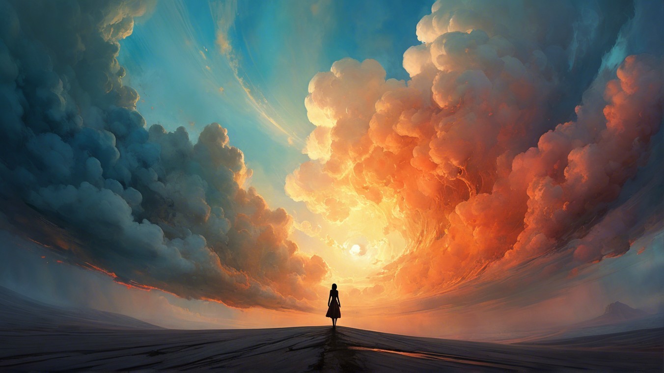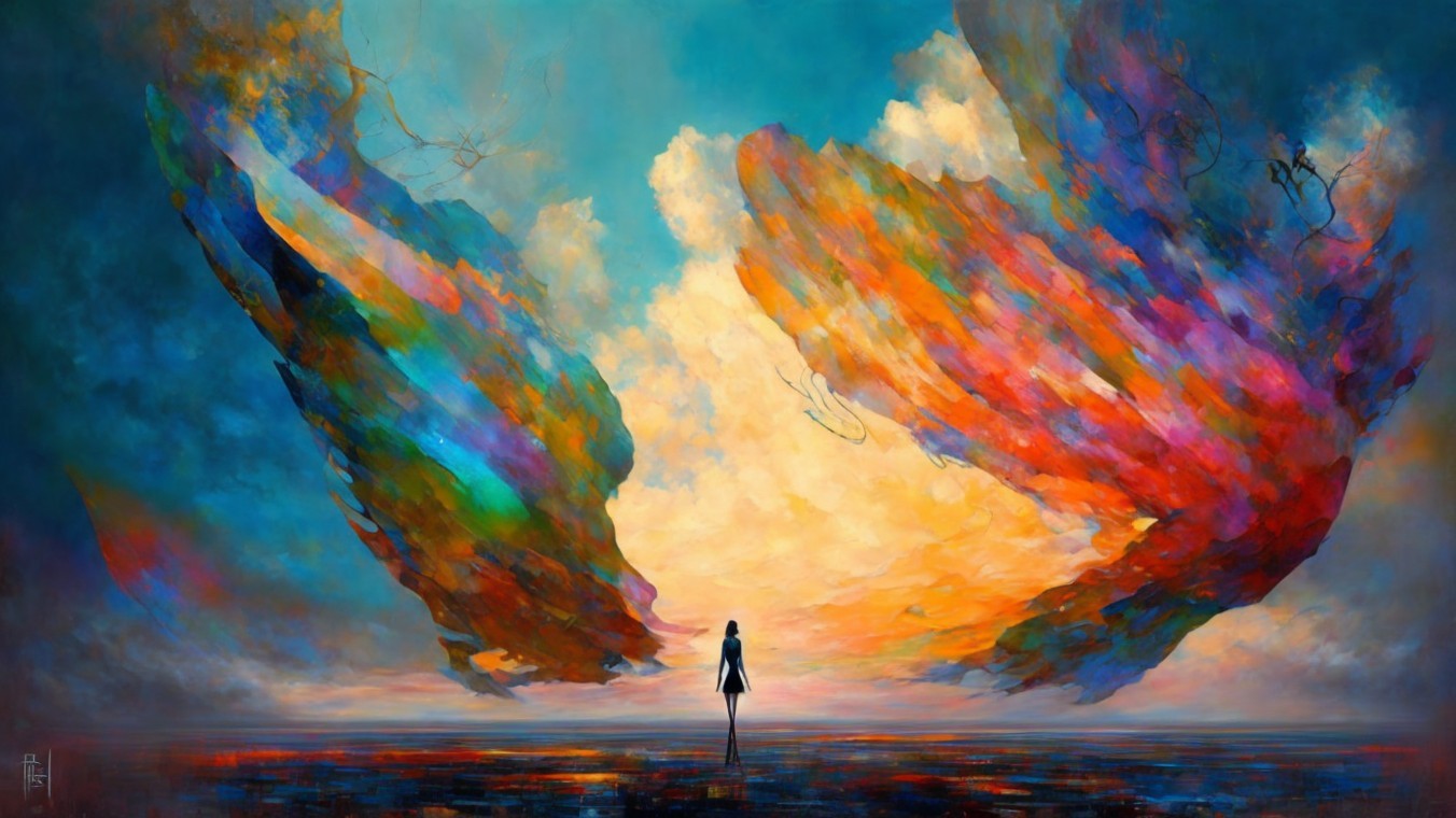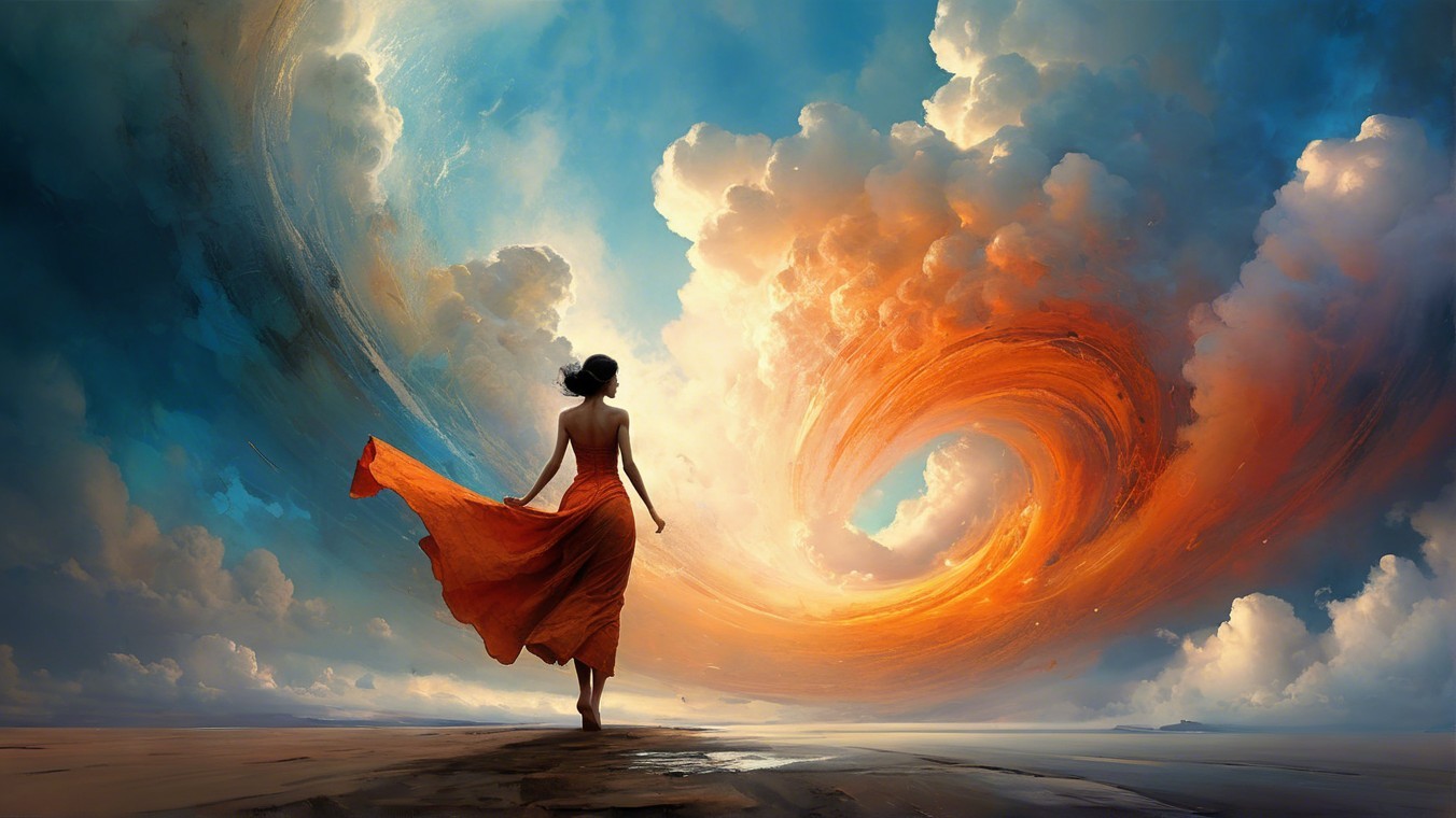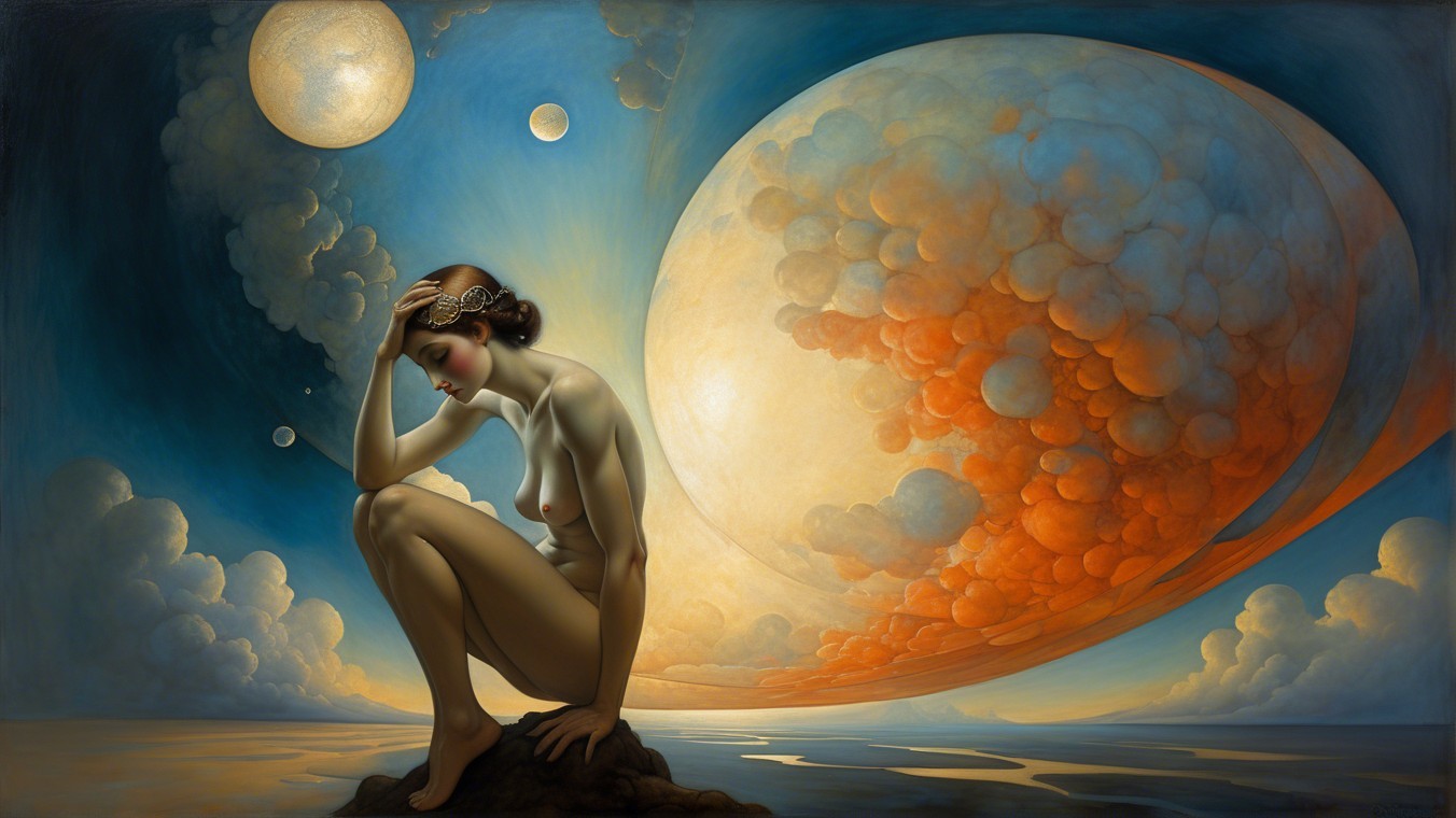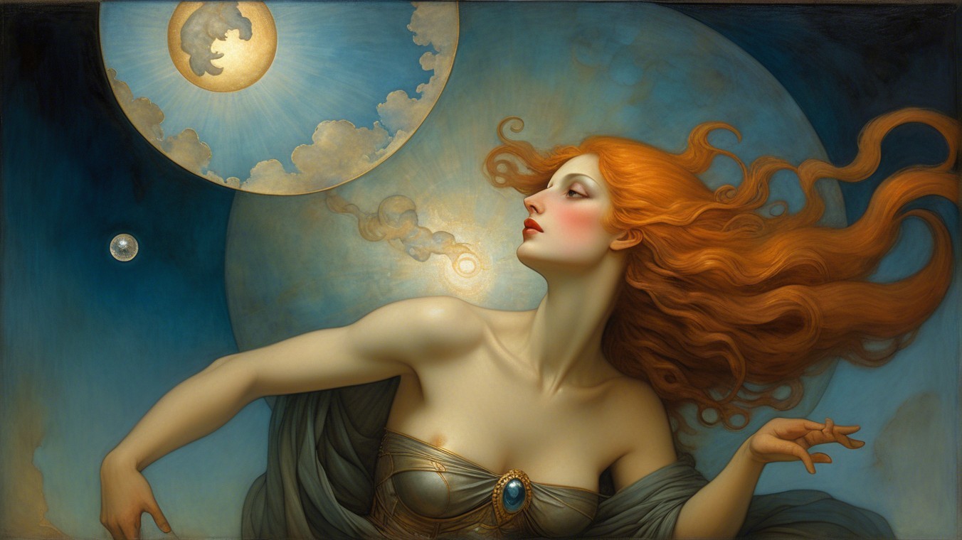 A luminous figure with flowing red hair gazes upward, adorned in a metallic outfit with gemstones. A large moon radiates in the background, adding an ethereal glow to the scene.