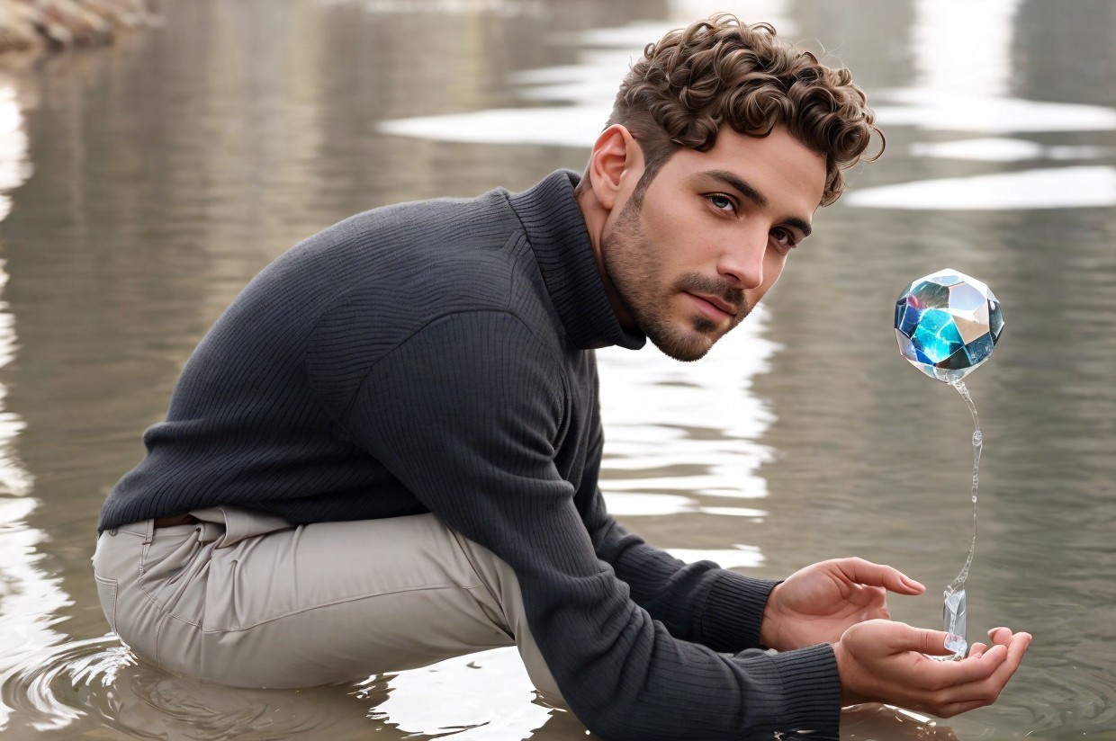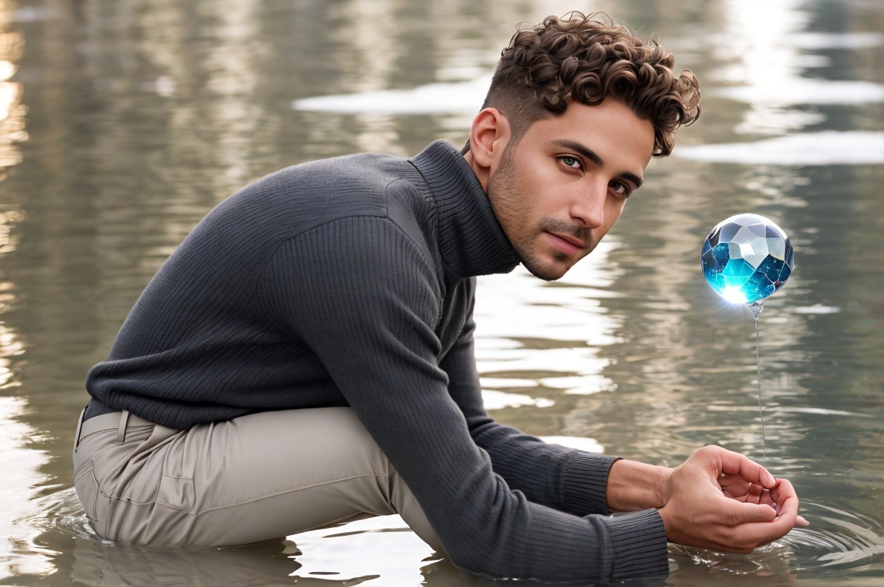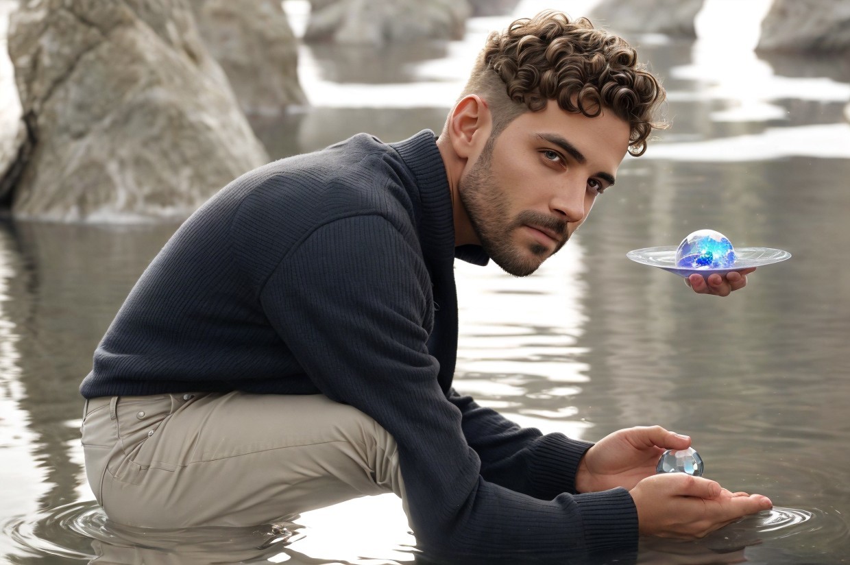 + Prompt:a man in his mid 30s with a short curly blondish hair and short stiff hair on his chin, his eyes are of a light grey color, he is sitting by the sluggish river with a little bit of ripples on the water and he is holding a crystal sphere with a blue glowing light inside, he looks at the woman's delicate hand with long beautiful fingers is sticking from the water holding a crown made of water lilies, the crown is surrounded by delicate light blue butterflies and sparkly diamond dust, style of French impressionists' paintings with a touch of realistic 3D graphics.