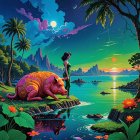 A vivid, surreal landscape featuring two figures by a tranquil, otherworldly sea, surrounded by giant tomatoes and a massive orange pumpkin, under a colorful sky with planets and shooting stars.