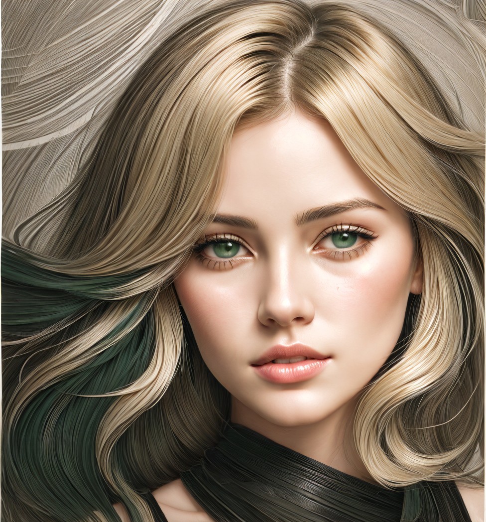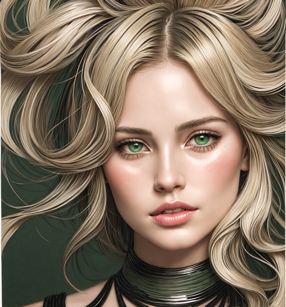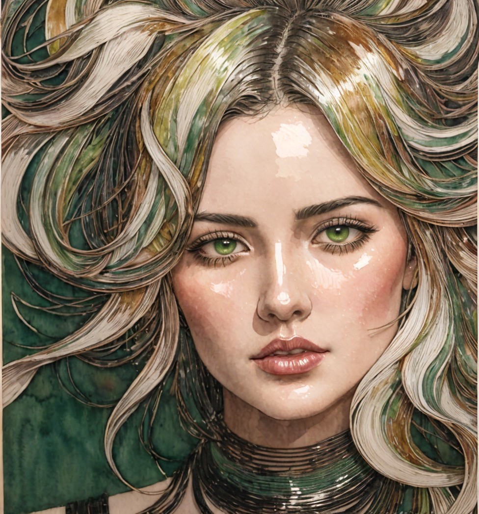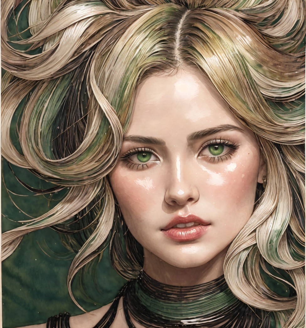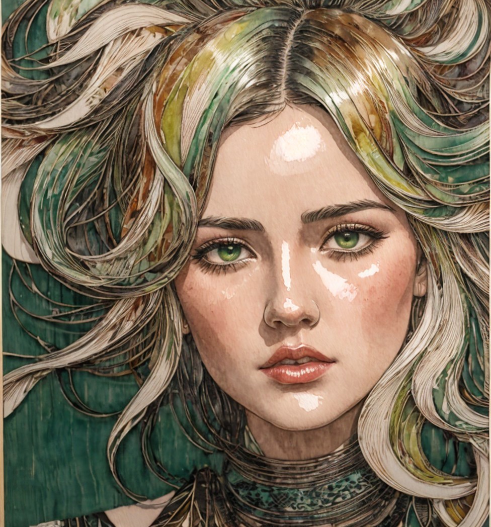 + Prompt:Portraiture in style of realistic woodblick print, quilling, glossy, Plushy cuts, delicate hairstyle in stacked lines, shiny, glossy, close-up portrait, wavy --ar 4:5 --style raw, Sandpaper gritty texture, abstract, charcoal sketch illustration on dark green background, a woman with high-contrast features: pretty pale skin, blonde hair, , striking bioluminescent eyes, bold auburn lips ,Intriguing elements include a splash of leafs and black ivy over the sides, outlining the face, splashing ink-like drips originating from her hair, sharp. streaks of black and Emerald flowing downward, custom_loss:black, embossed strokes, triadic color scheme Emerald beige lilac, Figurative, comical, Stylized woodblock print, headshot of stylized beautuful female, traumacore 1.9, beautiful composition 1.9, space age style merged with marvel comic book art style, stylized line-art, layered geometrical vector illustration, hues, custom_loss: black, style of Georgia O'Keefe, Margaret Keane, Waterhouse, synthetic, encaustic streaks in stylized depiction, fine strokes, concept art, 3d effects, ,american gothic 1.5, octane render illustration, dreamscape, blurry edges, intricate blonde hairstyle with encaustic streaks, very stylized illustration 1.8, soft rounded edges, quaint, high plasticity, spiritual essence, hues, voluptous, dethereal, anisotropic filtering 1.7, , bokeh effects, stunning color depth, creamy, blurred background, graceful, modernist fashion photography,